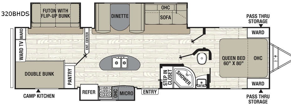 As you enter model 320BHDS notice how open the combined kitchen and living space is with dual slides fully extended. There is a slide out refrigerator, three burner range, and counter with microwave oven to your immediate left inside the door. Just off the slide there is a nice size pantry for all of your food storage needs, and the off center island features a double sink, and added prep space that the cook in the family will love. You will also appreciate the use of an outdoor camp kitchen for when you want to spend a little more time outside while cooking.