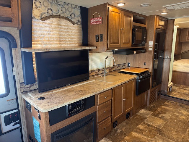 Inside, the dual slide-outs open the living area dramatically, giving you a spacious lounge that includes a comfortable sofa, dinette, large entertainment setup, and a well-equipped kitchen with ample countertop space and storage. The private rear bedroom features a walk-around queen bed, wardrobe storage, and direct access to the bathroom area. The overhead bunk adds flexible sleeping capacity, making this a great fit for families or couples who enjoy having extra room.