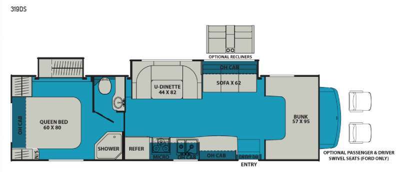 The 2016 Coachmen Leprechaun 319DS is a 32-foot 11-inch Class C motorhome built on a Ford E-450 chassis, known for its spacious floor plan with two slide-outs and sleeping capacity for up to 8 people.