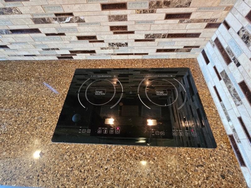 Gourmet Kitchen – Solid-surface countertops, 3-burner range, convection microwave, residential refrigerator, and abundant storage