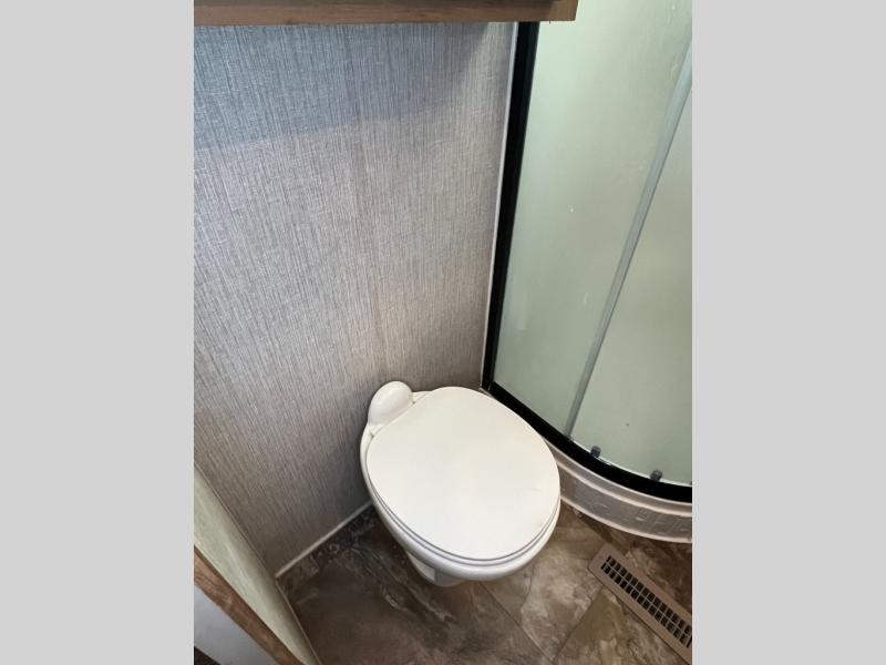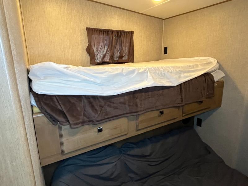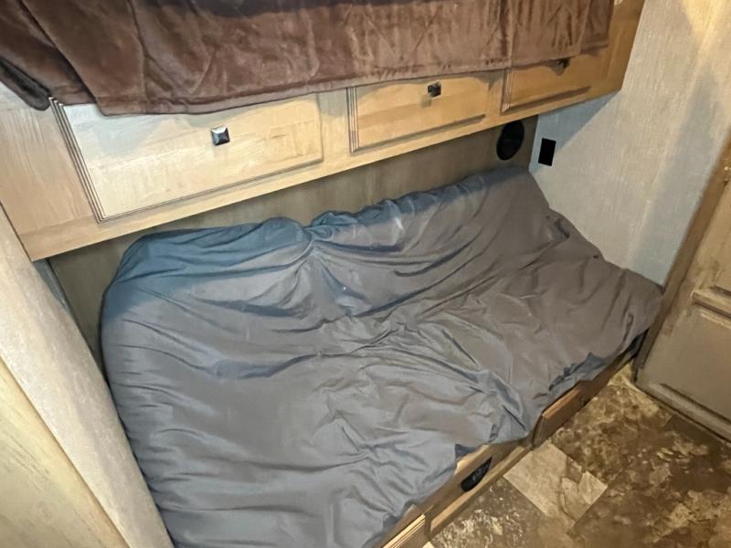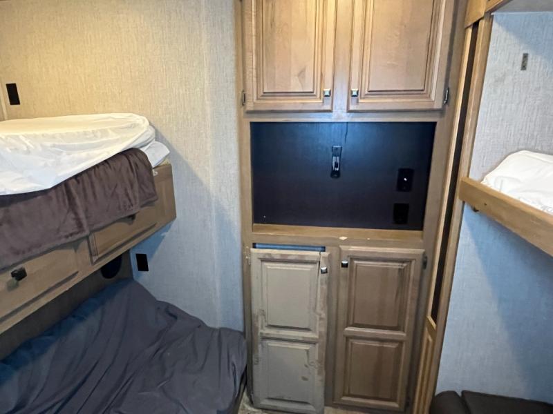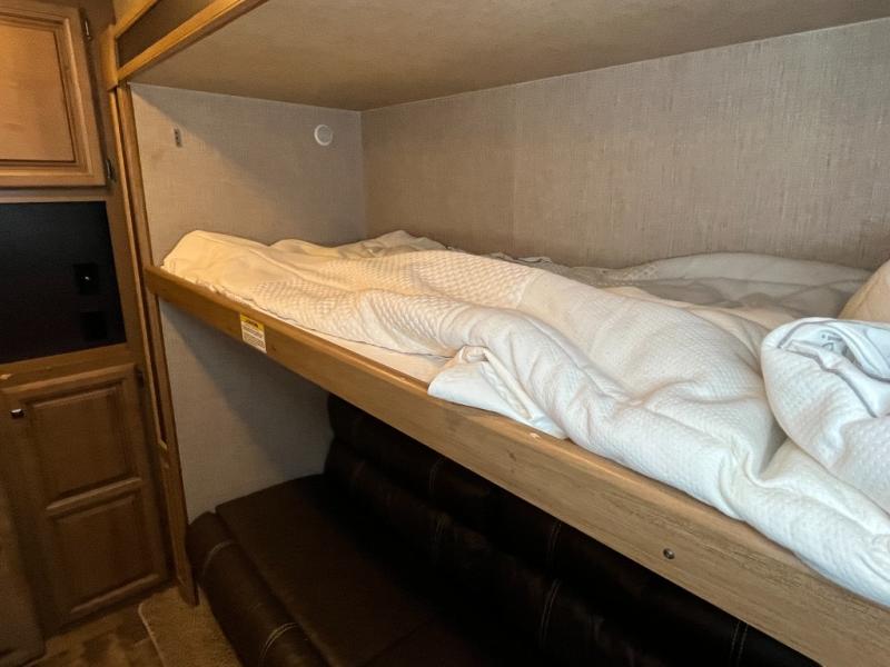 In the rear of the fifth wheel you will come to the bunk house. Your kids will enjoy all of the space that this room has to offer. Along one side there is a slide with a sofa on the bottom and a flip-up bunk above the sofa. Next to the sofa is an entertainment center. Across from the sofa there is a lower and upper bunk.