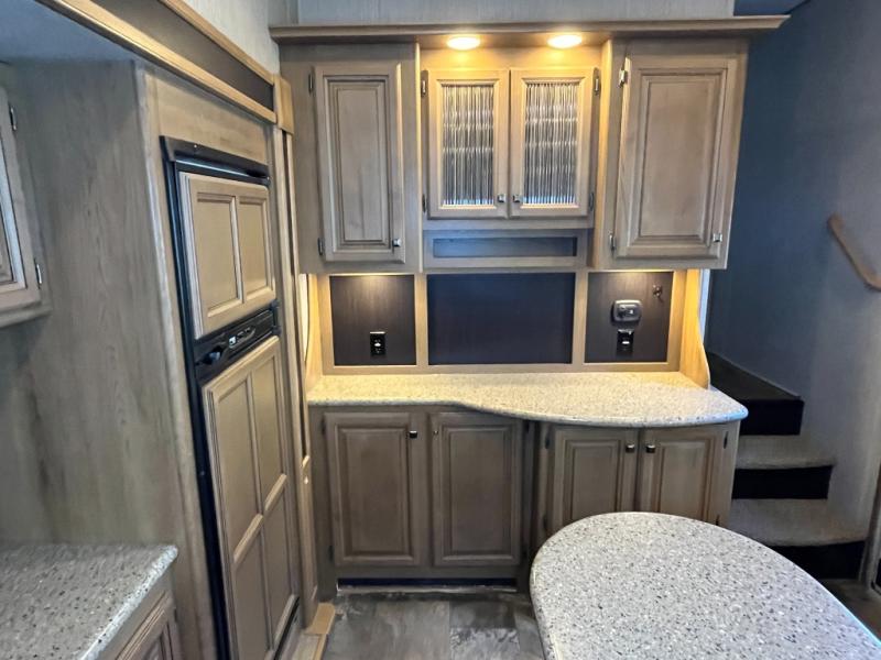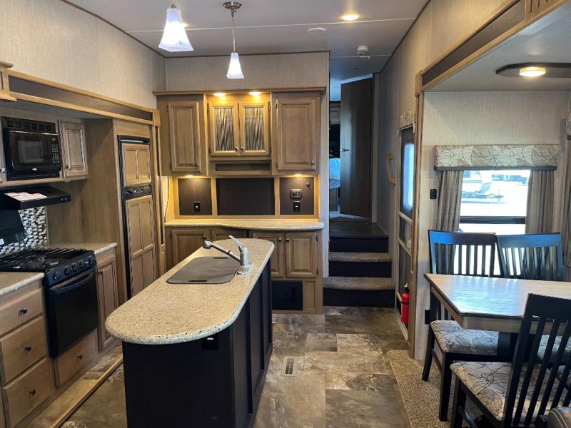 As you enter the fifth wheel, to the left there is a slide with a free-standing dinette and chairs, and a sofa. Next to the slide you will find a large cabinet. One side of the kitchen has a large slide with an entertainment center, fireplace, pantry, three burner range, microwave, and refrigerator. In the middle of the kitchen you will notice the island with a double kitchen sink.