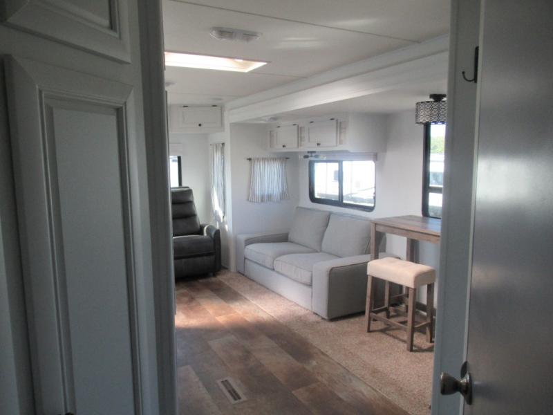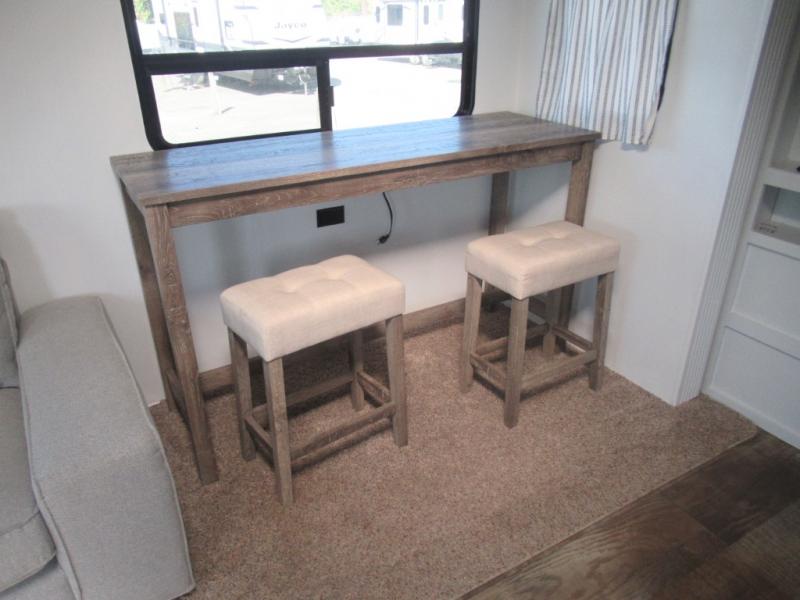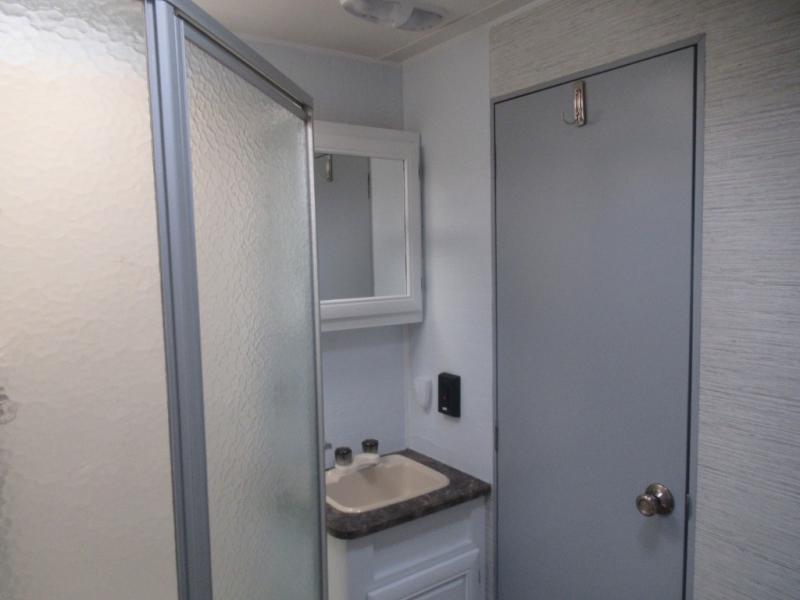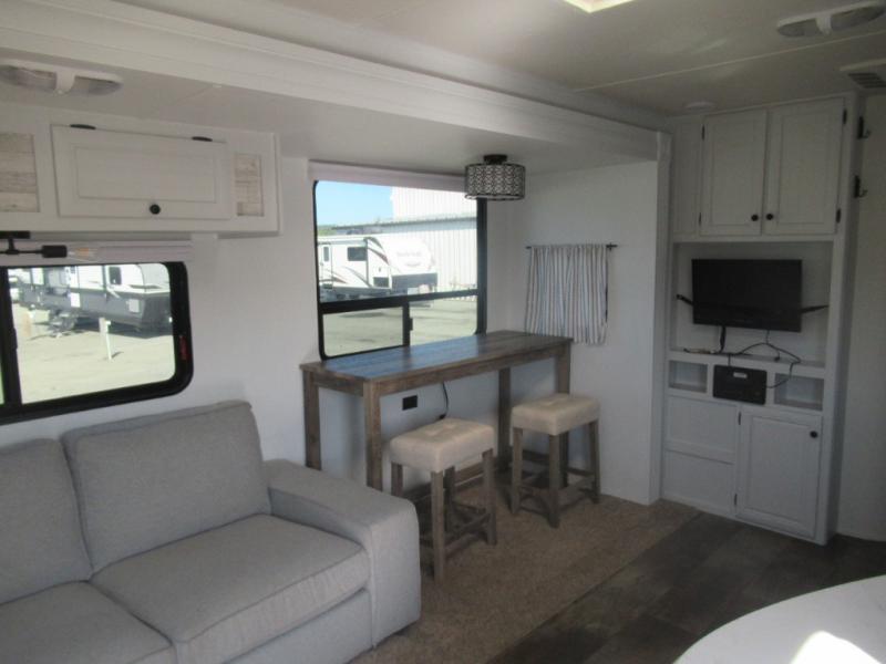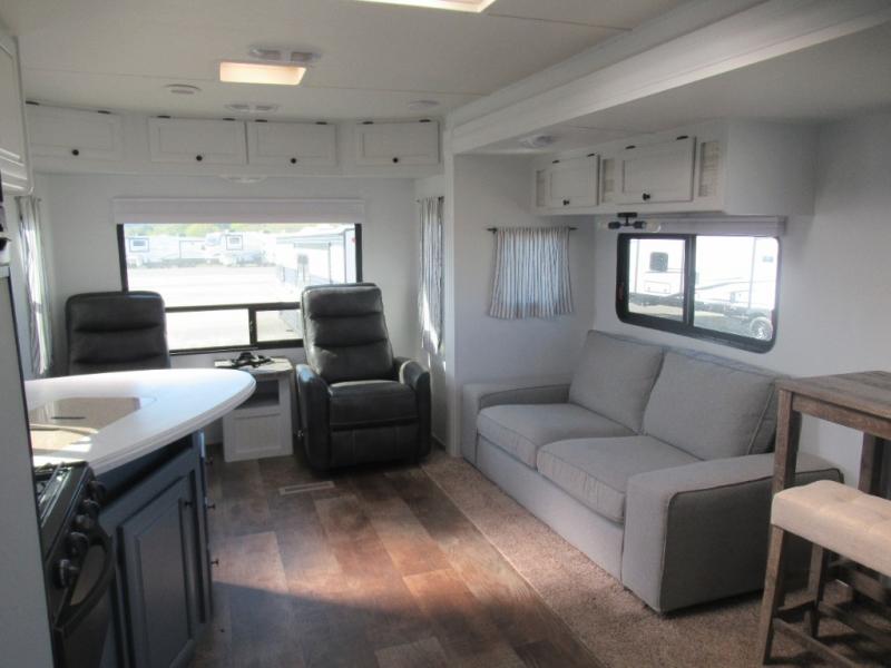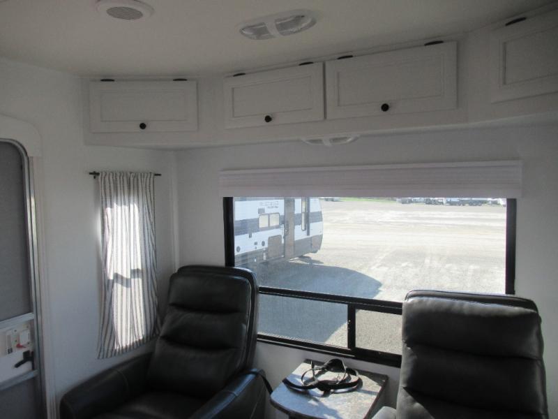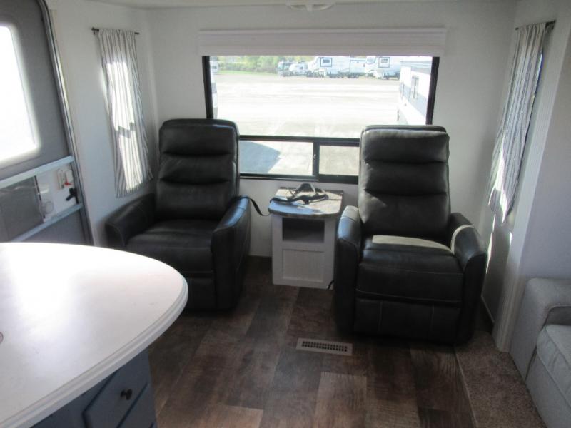 As you enter the door closest to the rear of the trailer you will notice two lounge chairs along the rear wall. The single slide along the road side wall features a sofa with overhead cabinet, and a Super booth dinette. In the corner you will find an entertainment center.