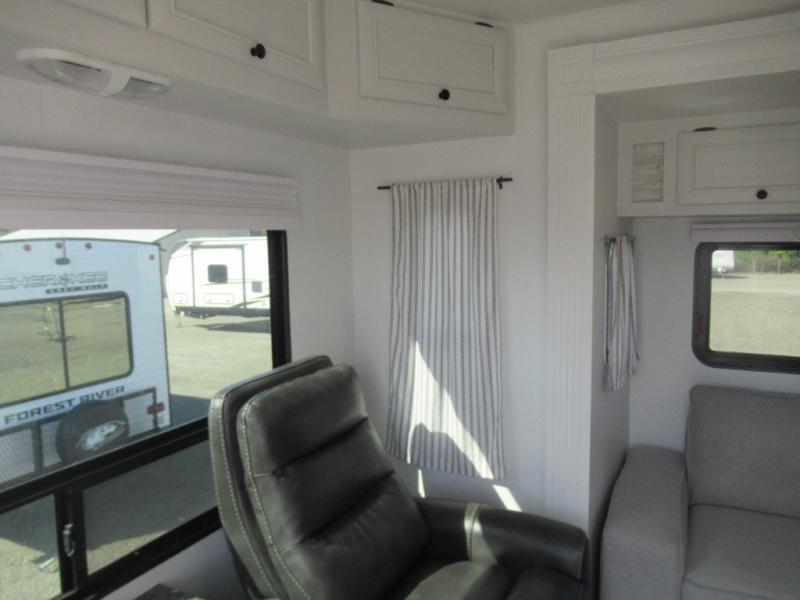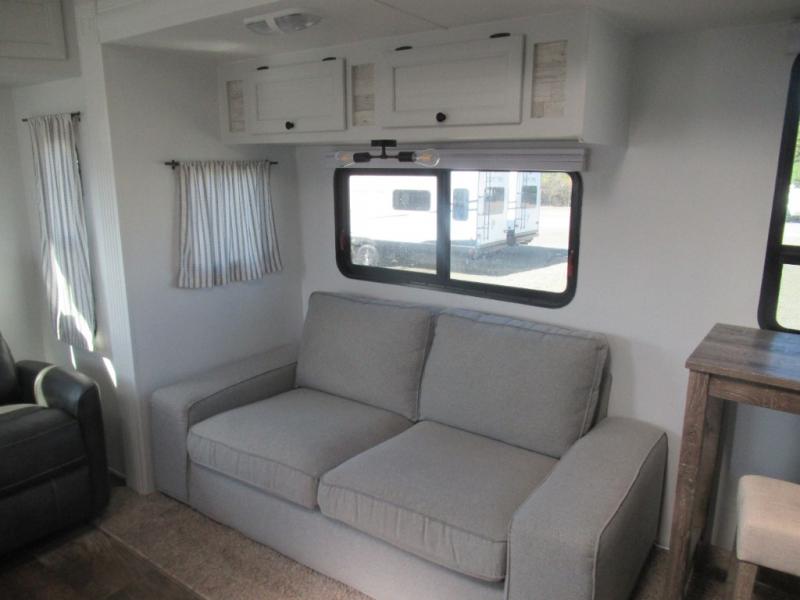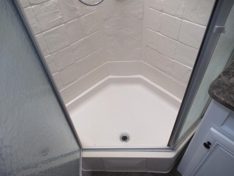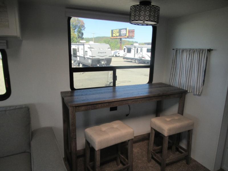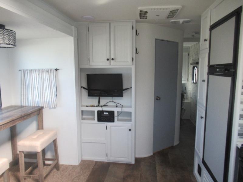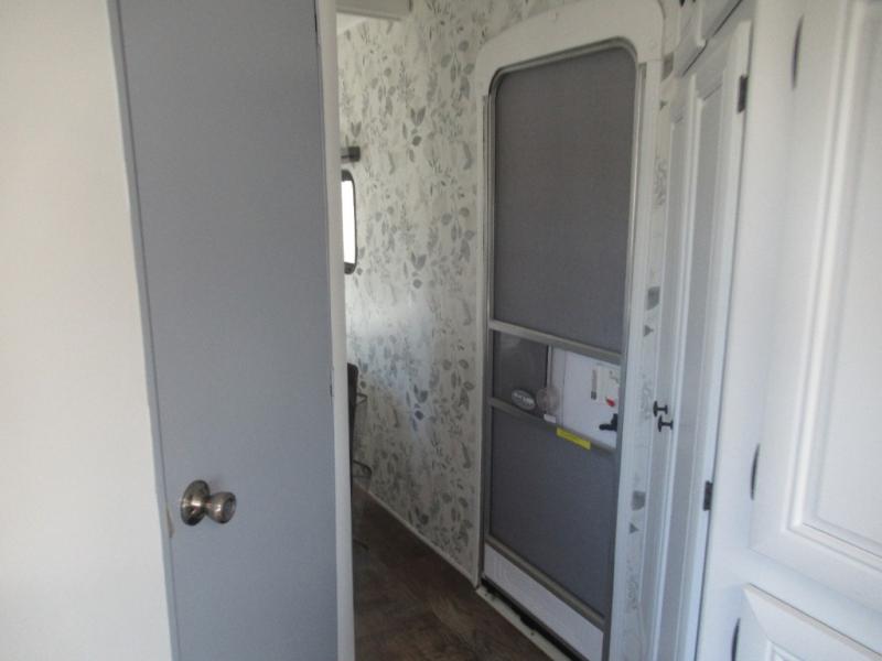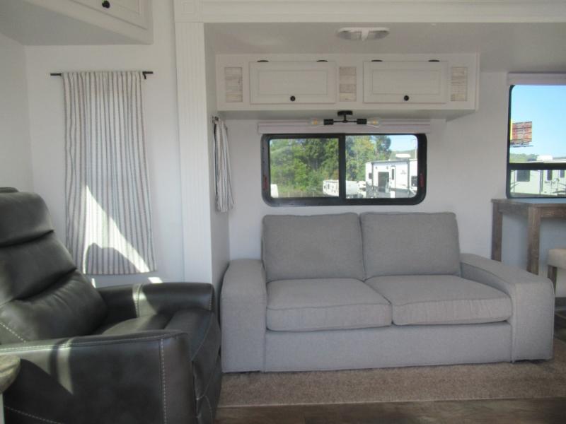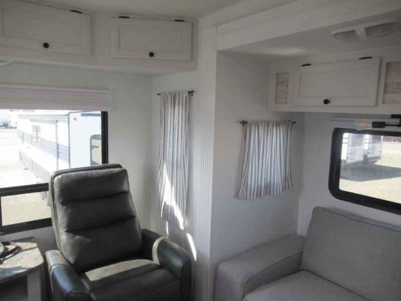 As you enter the door closest to the rear of the trailer you will notice two lounge chairs along the rear wall. The single slide along the road side wall features a sofa with overhead cabinet, and a Super booth dinette. In the corner you will find an entertainment center.