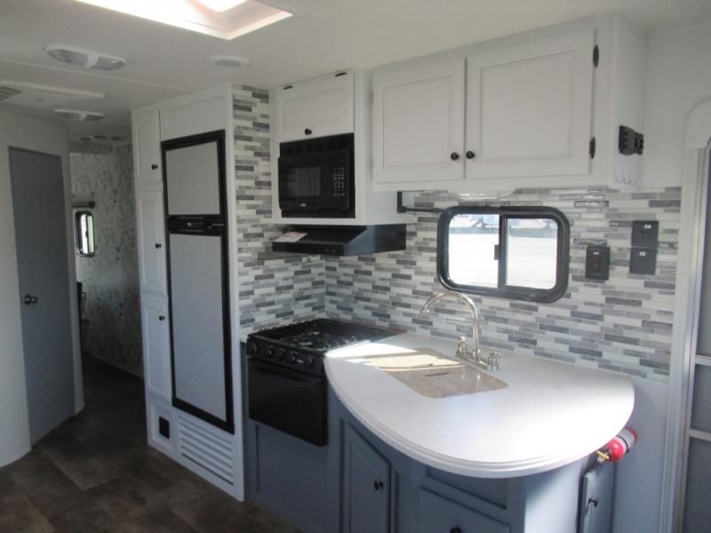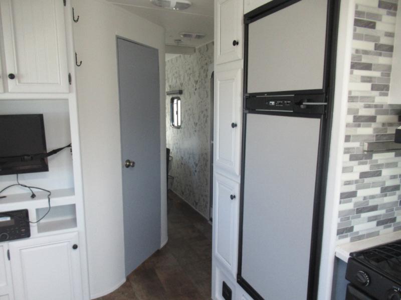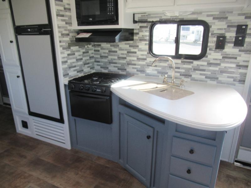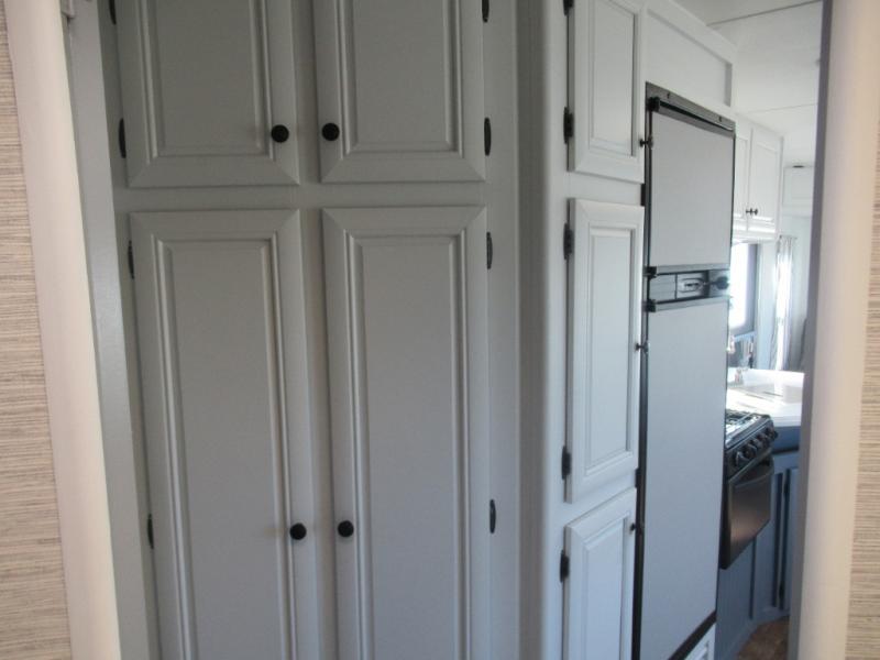 On the opposite side of the travel trailer there is a double kitchen sink on an angled counter, three burner range, microwave, refrigerator, pantry, and corner linen cabinet. Next to the linen cabinet you will find the second entry door into the trailer.
