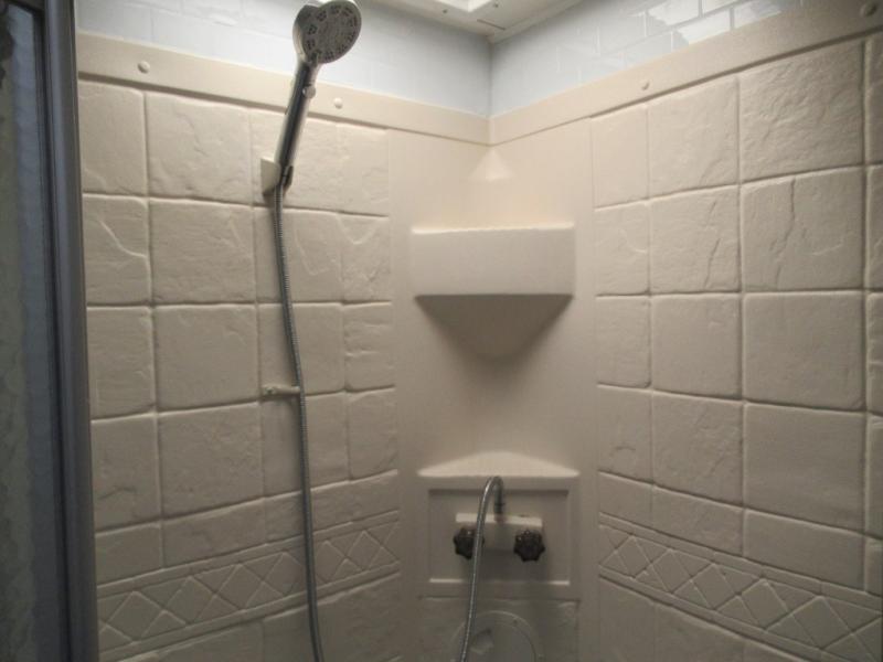 The side aisle bath has a corner shower, sink, medicine cabinet, and toilet. There is also a private entrance from the bathroom into the bedroom.