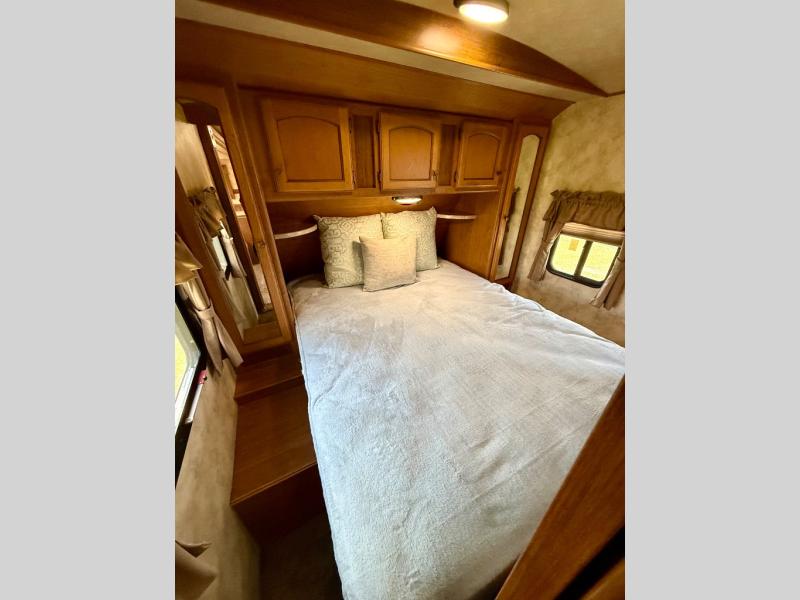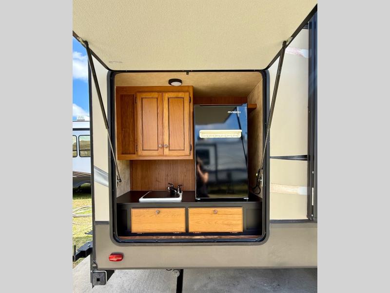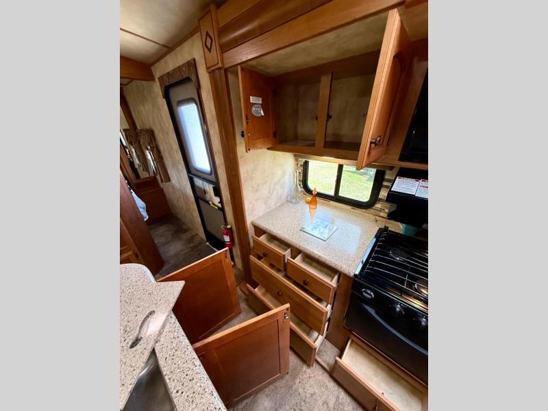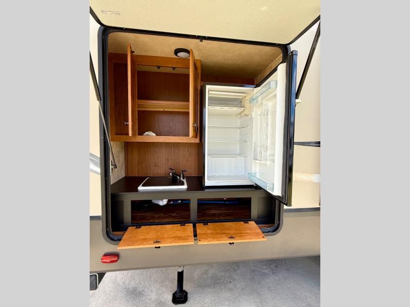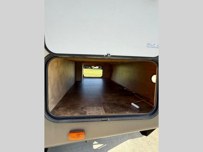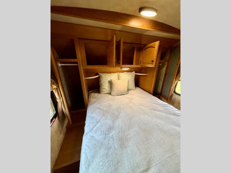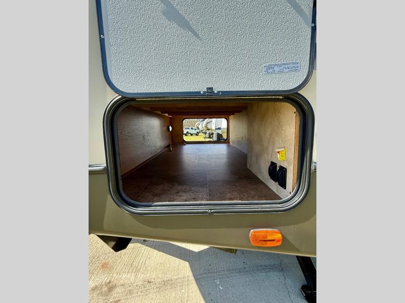 There are plenty of overhead cabinets throughout the travel trailer as well as a large pass thru storage area.