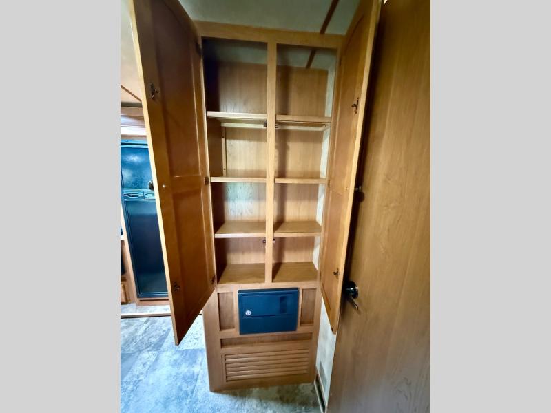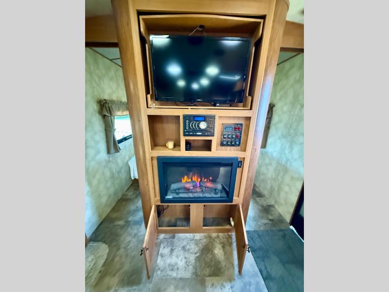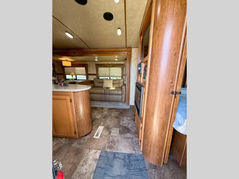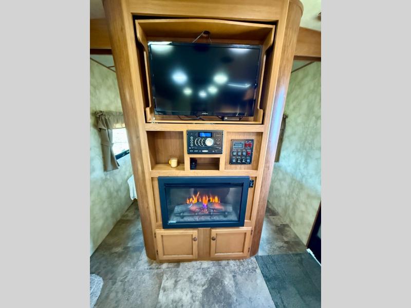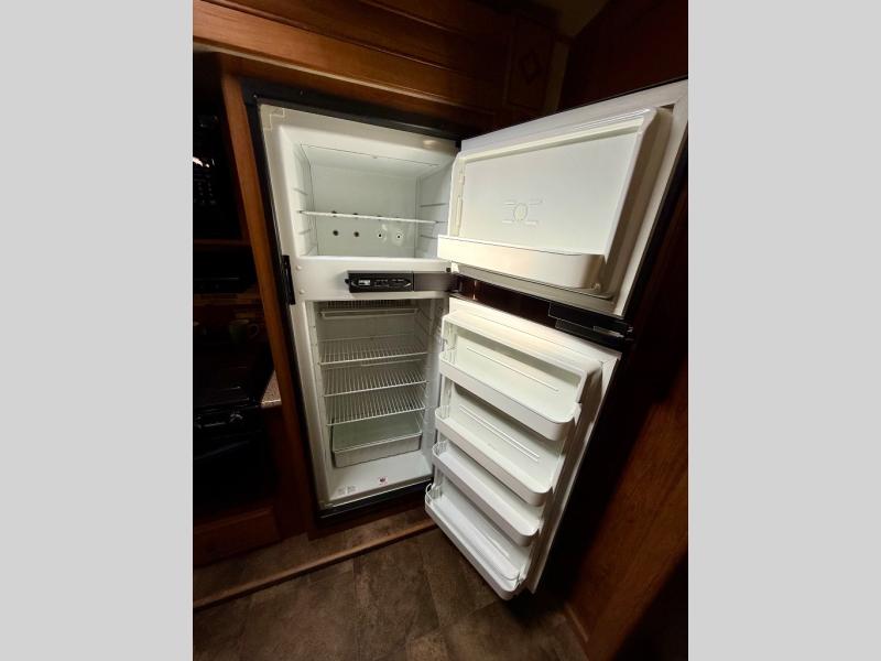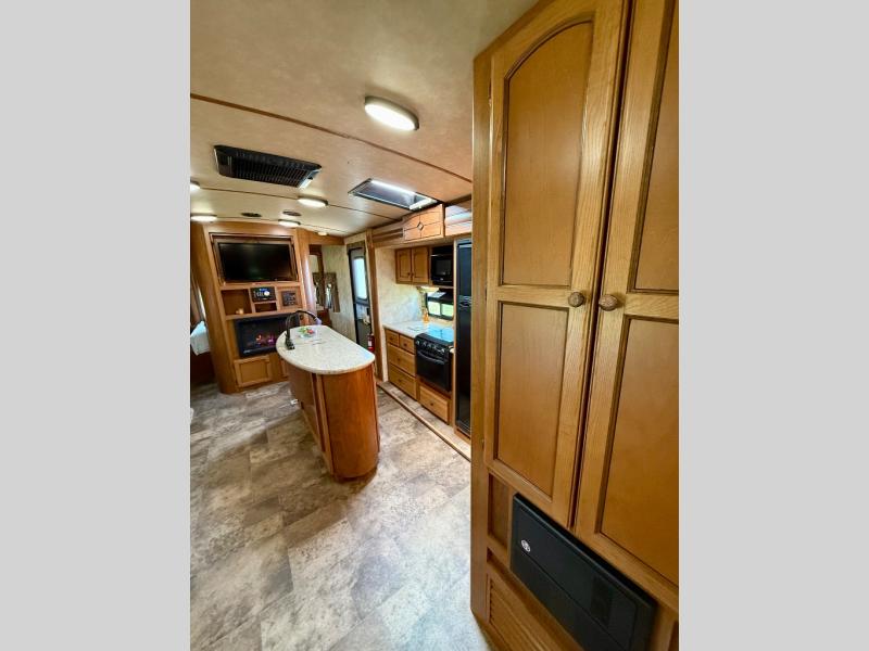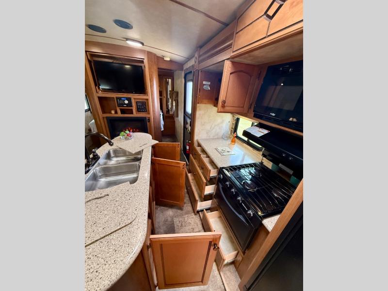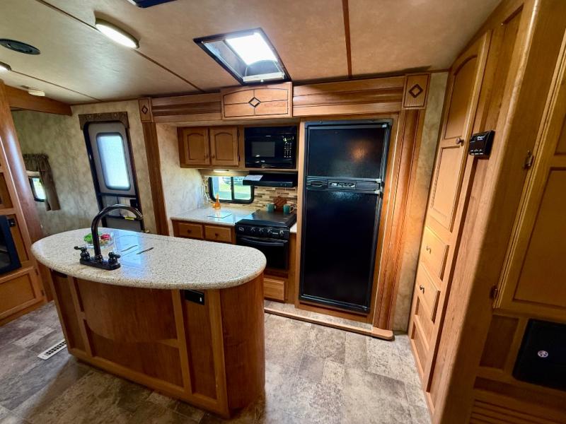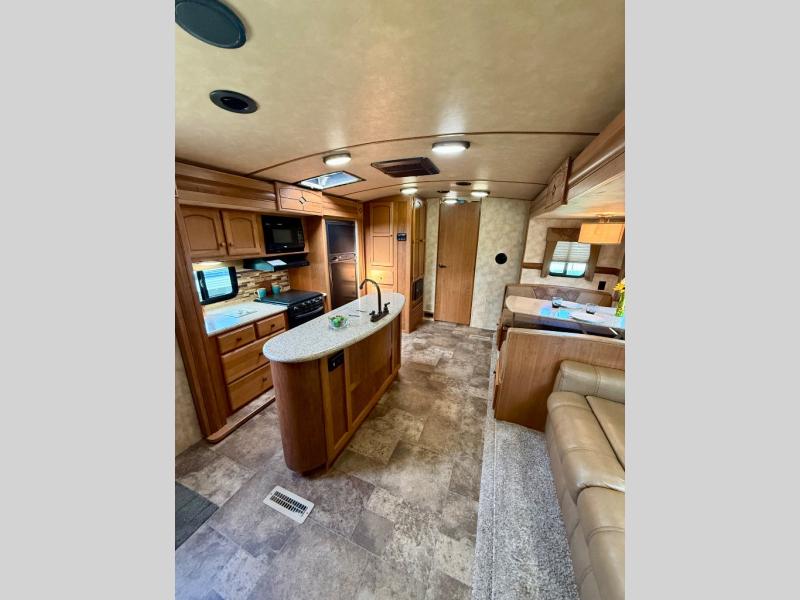 Upon entering the travel trailer, to the left there is a slide with a microwave, three burner range, and refrigerator. Next to the slide there is a large wardrobe/pantry. The opposite side of the trailer has a slide with a super booth dinette, and sofa. Along the front wall in the main living area you will find an entertainment center. The kitchen island has a double kitchen sink and extra counter space.