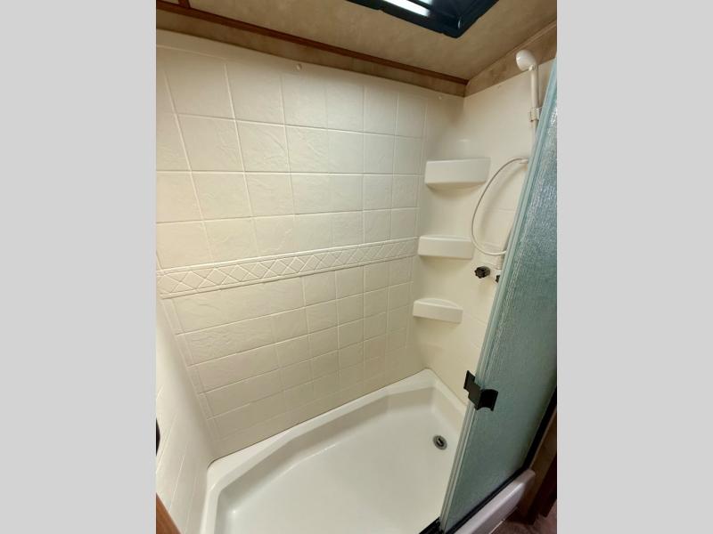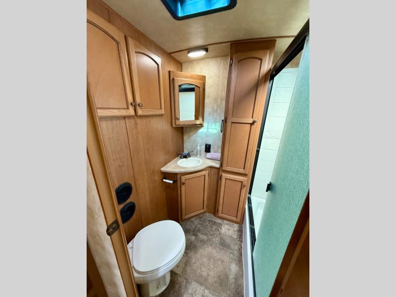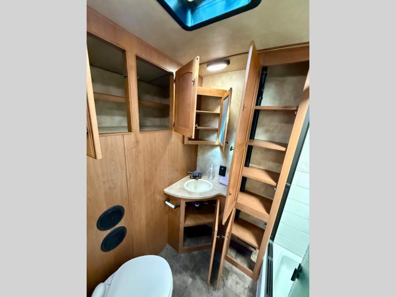 In the rear you will find the bathroom with a shower, linen cabinet, sink, medicine cabinet, and toilet.