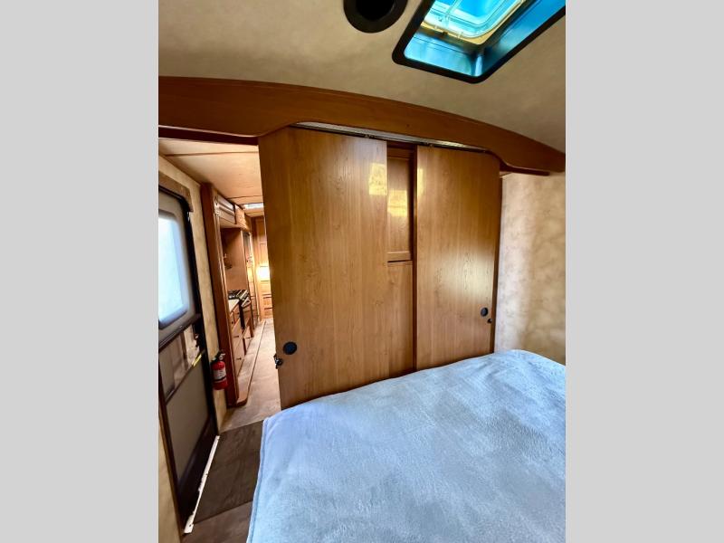 The front bedroom greets you with a queen bed, shirt closets, and an overhead cabinet.