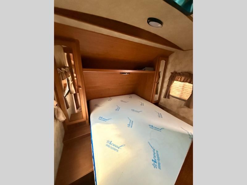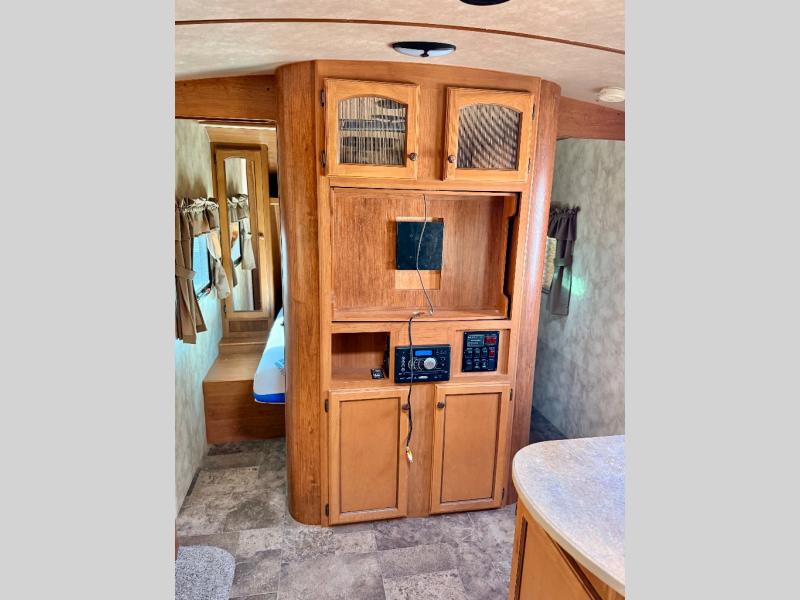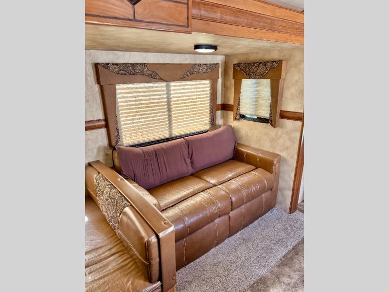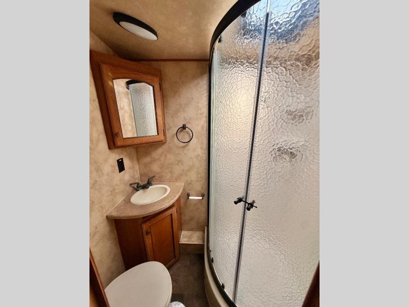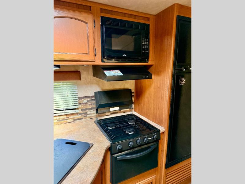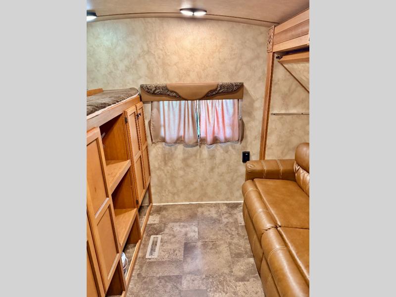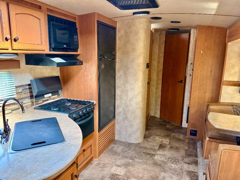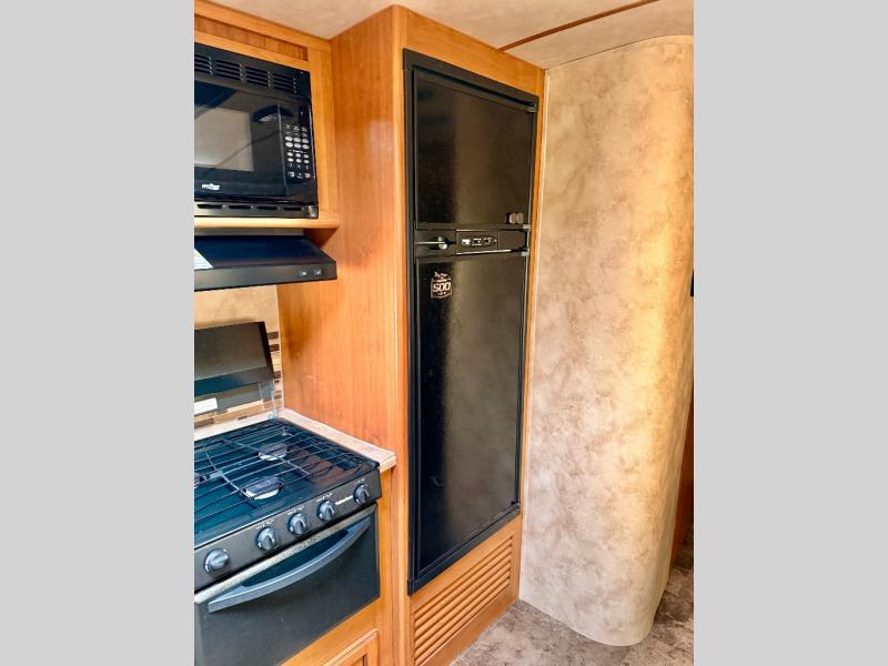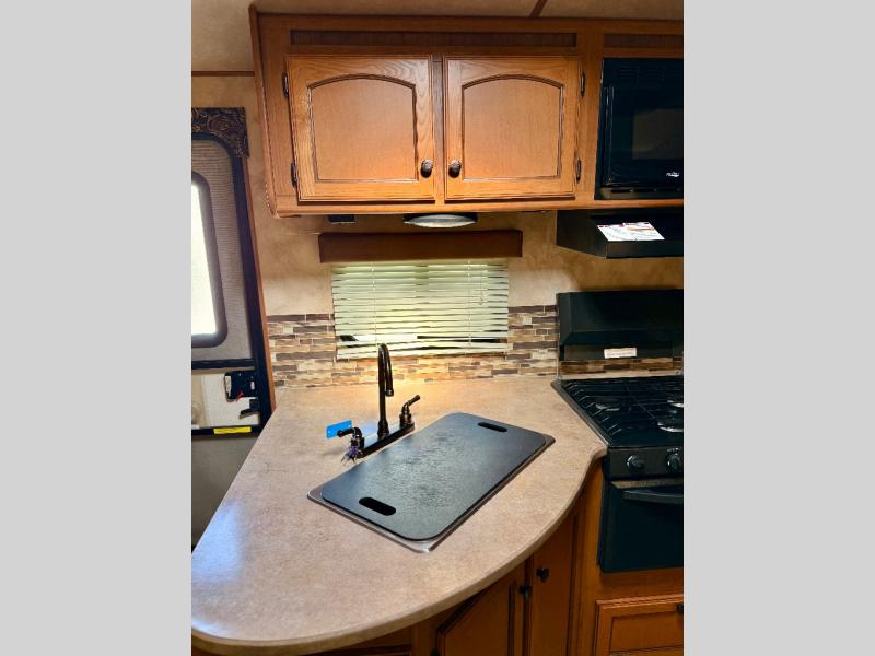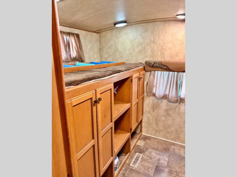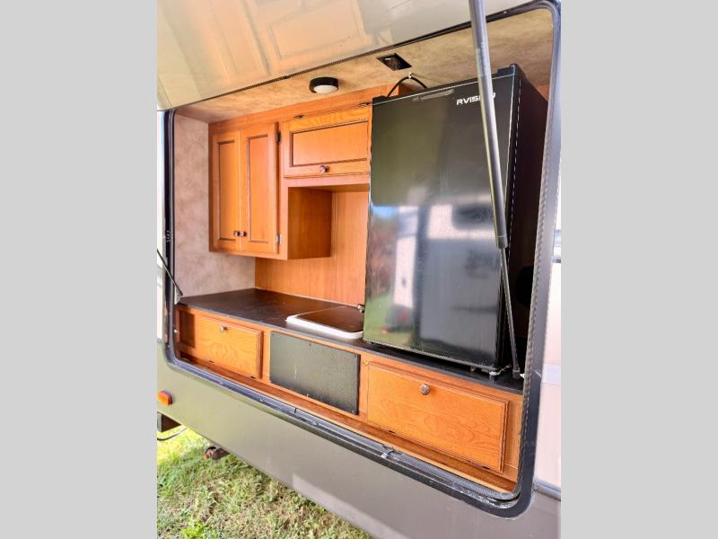 There are plenty of overhead cabinets throughout the travel trailer as well as an exterior pass thru storage. You are also sure to enjoy the outside kitchen which has a sink, and refrigerator.