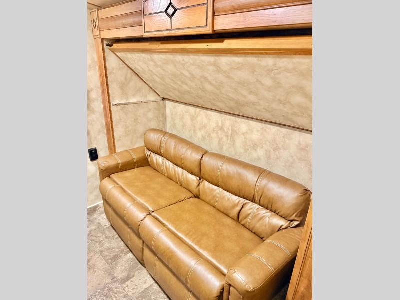 The rear bunk house offers a sofa slide on one side and an entertainment center with a bunk above the entertainment center on the other side.