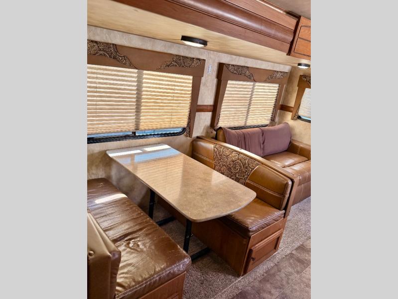 The main living and kitchen area has an entertainment center in the front, and one side has a slide with a sofa and dinette. Next to the dinette there is a large pantry. The opposite side of the travel trailer has a double kitchen sink, three burner range, microwave, and refrigerator.