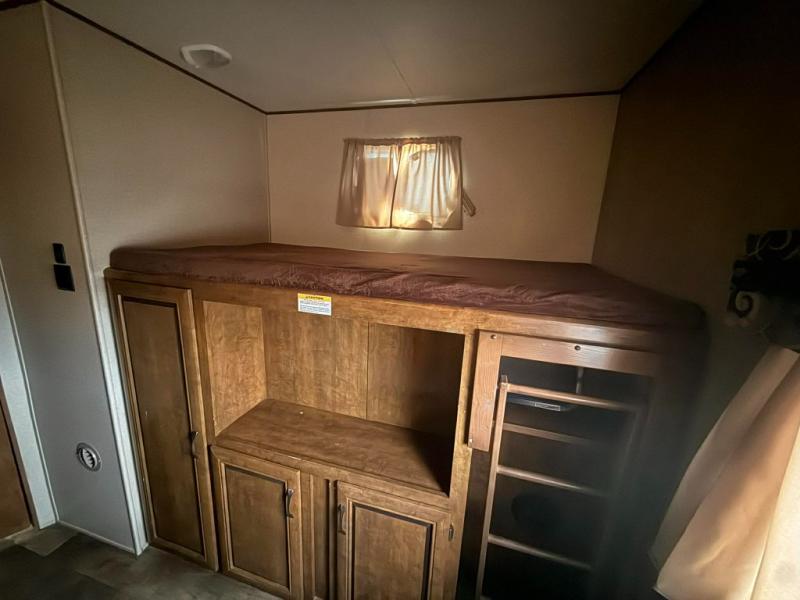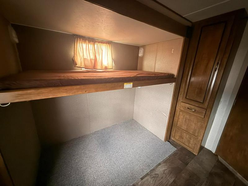 In the rear you will find a large bunk house. There is a closet, slide with a sofa. The opposite side of the travel trailer has a large wardrobe with a bunk above the wardrobe.