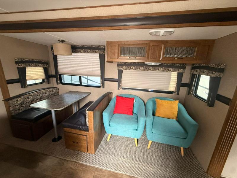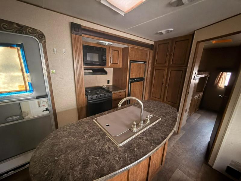 As you enter the travel trailer, to the left there is a slide with a range, microwave, and refrigerator. Next to the refrigerator you will find a large pantry. The opposite side of the travel trailer has a booth dinette and a sofa slide. You are sure to enjoy the space that the kitchen island has to offer. The double kitchen sink is located in the island as well as a bit more counter space. To the right of the entrance there is a handy coat closet and around the corner an entertainment center.