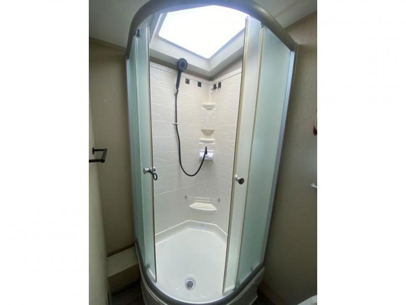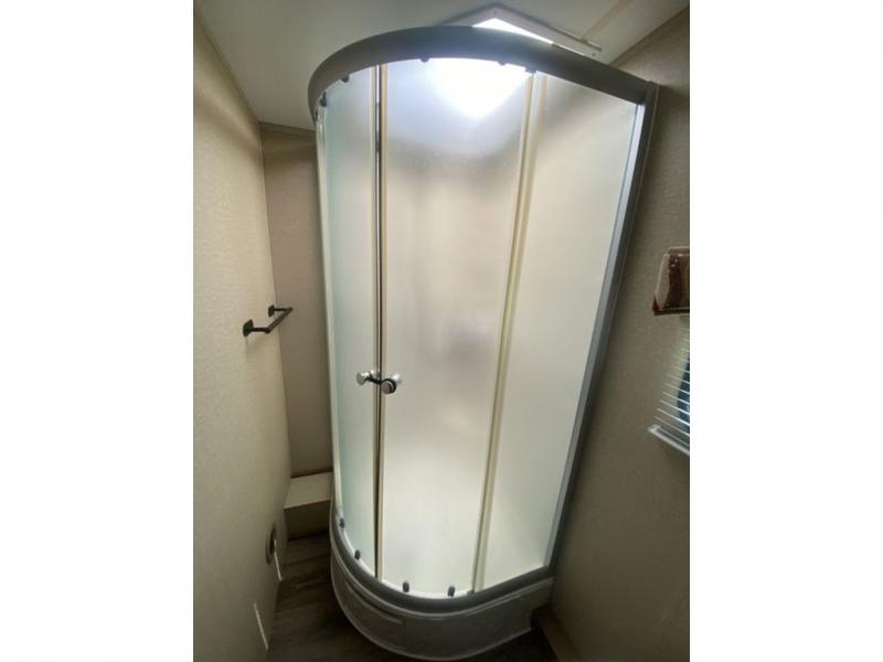 The rear bath runs the full width of the trailer. The bath includes a corner shower, toilet, sink, and linen storage.