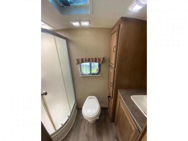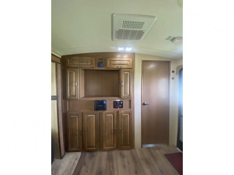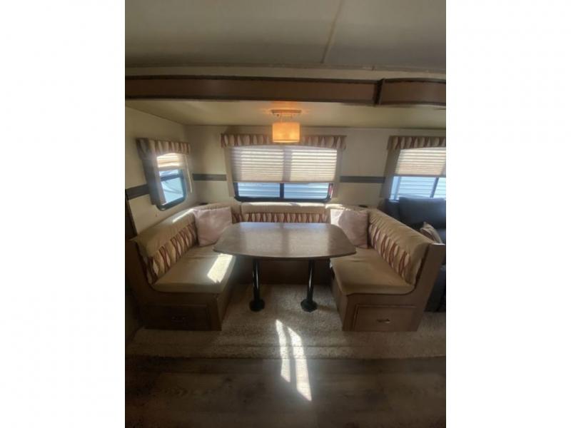 On the opposite side is a slide out including a sofa, and u-shaped dinette for meal time or visiting. You will enjoy the entertainment center and TV on the interior half wall that faces the kitchen and living room.