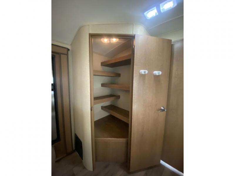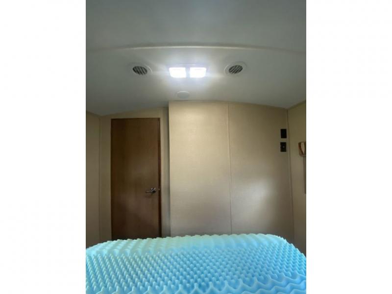 As you step inside to your right is a front bedroom with a single door for privacy. There is a bed, two wardrobes, two nightstands, and overhead storage also.