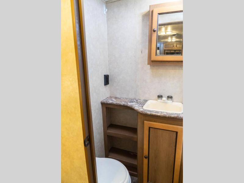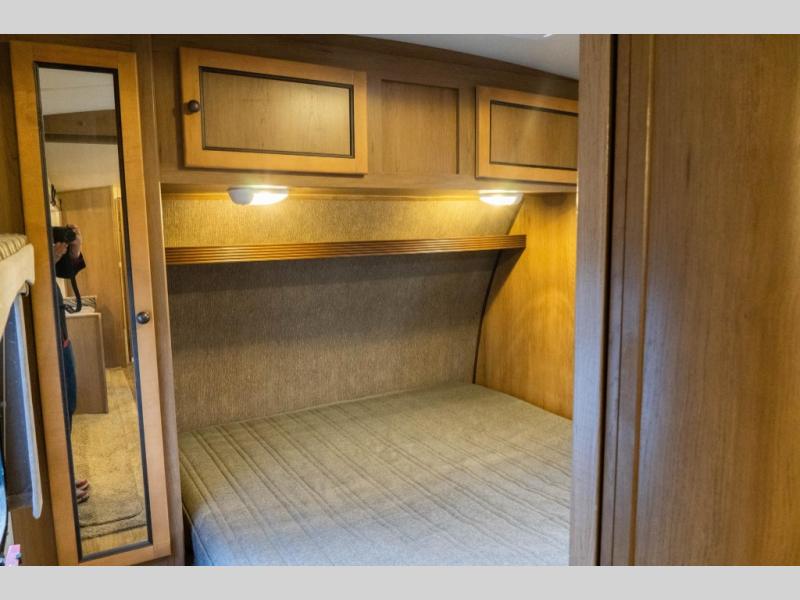 The very front of model 260BHS feature a lift-up queen bed. There is plenty of storage with wardrobes on both sides of the bed, plus overhead cabinets above for additional storage, not to mention underneath the bed for larger items like extra blankets, pillows, and more.