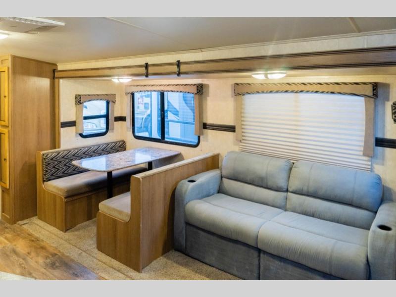 Step inside the main side entry door and be greeted by a spacious interior with large slide out super booth dinette and sofa/sleeper. The sofa can quickly become additional sleeping space when folded down at night and the booth dinette can also become a bed.