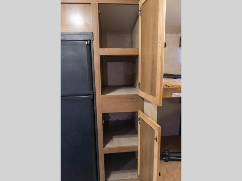 Across from the slide you will find that the kitchen has all the amenities you need to prepare and cook food for your entire family while away from home. There is a pantry for dry goods, a refrigerator, range with oven including a microwave oven, and a double kitchen sink making cleanup a breeze too.
