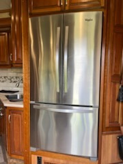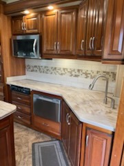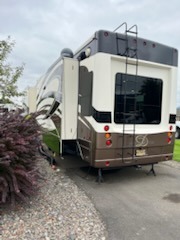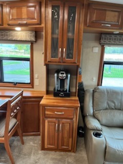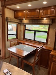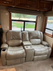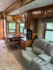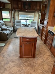 As you enter this fifth wheel you will find two opposing slides in the kitchen and living room area. These slides help to open up the floor space. The slide along the door side has a dinette with two chairs, overhead cabinet, and theatre seats with cup holders. The opposing slide features a TV, three burner range, angled double kitchen sink, and overhead cabinet. Next to the sink you will find a refrigerator. In the middle of the kitchen there is an island which gives extra counter space for meal preparation. Along the rear wall there is a sofa with an overhead cabinet above.