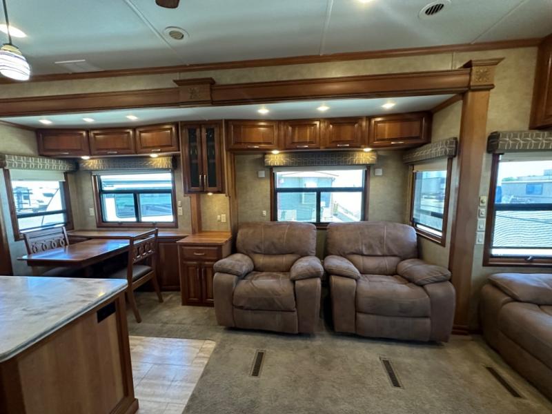 The combined living and kitchen area has multiple slides. On the door side there is a slide with two theatre seats with cup holders, a hutch, a dinette table with chairs, and overhead cabinets for additional storage. Opposite there is a slide with an entertainment center, and optional fireplace with overhead storage.