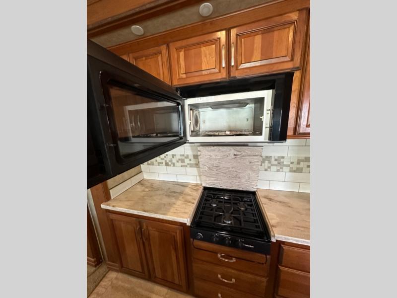 The kitchen area slide provides all the amenities you need to prepare and cook meals and snacks for your entire family. There is a residential refrigerator, three burner range, counter area, convection oven and overhead cabinets for storage. A convenient island features dual sinks, and extra counter space for food preparation.