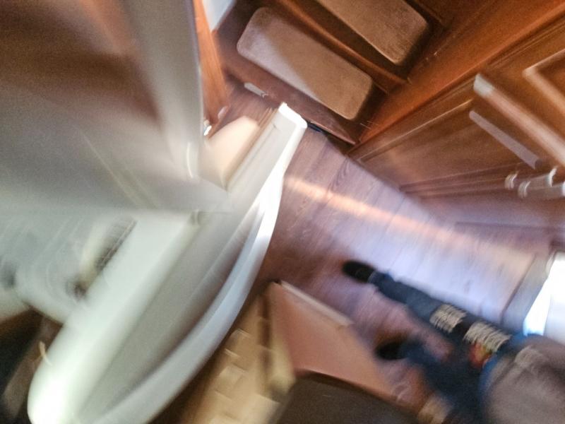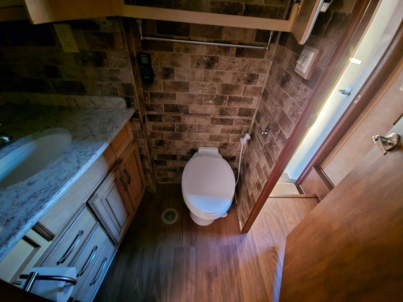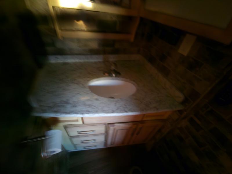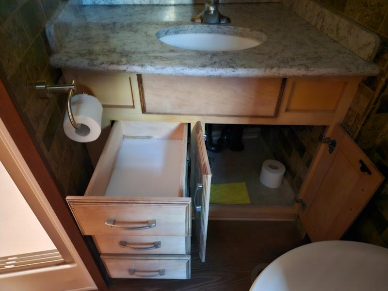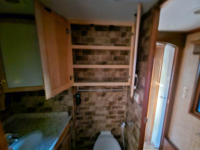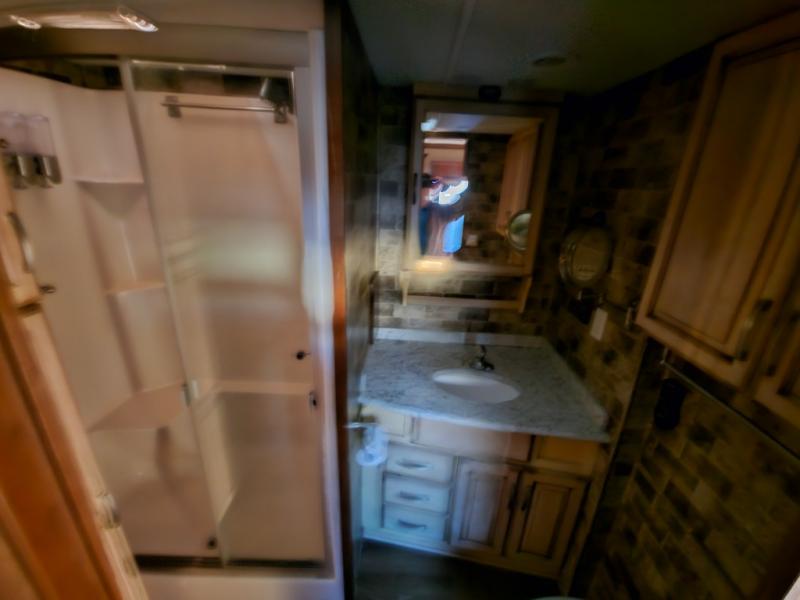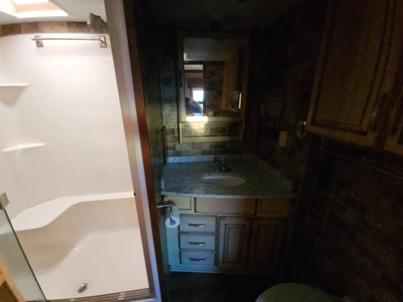 Head up the steps just off the refrigerator slide to the front bed and bath. The bath offers a 48" tub/shower, a vanity with sink, toilet and linen cabinet.