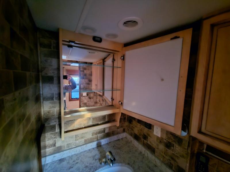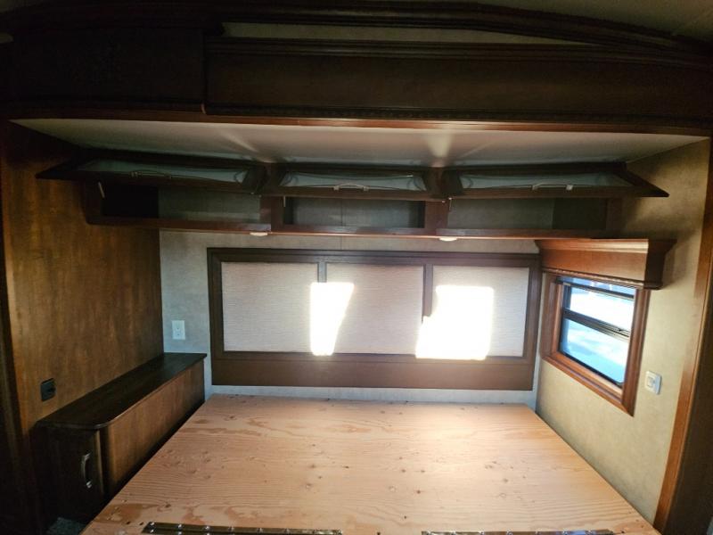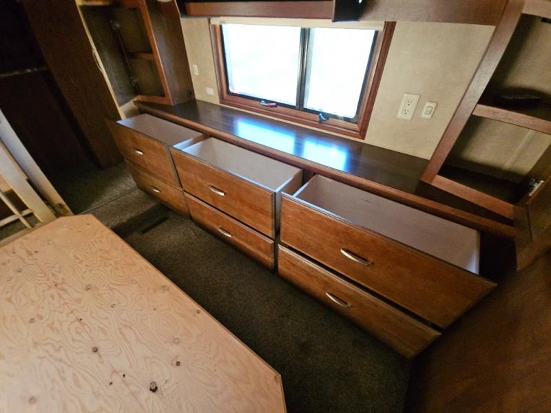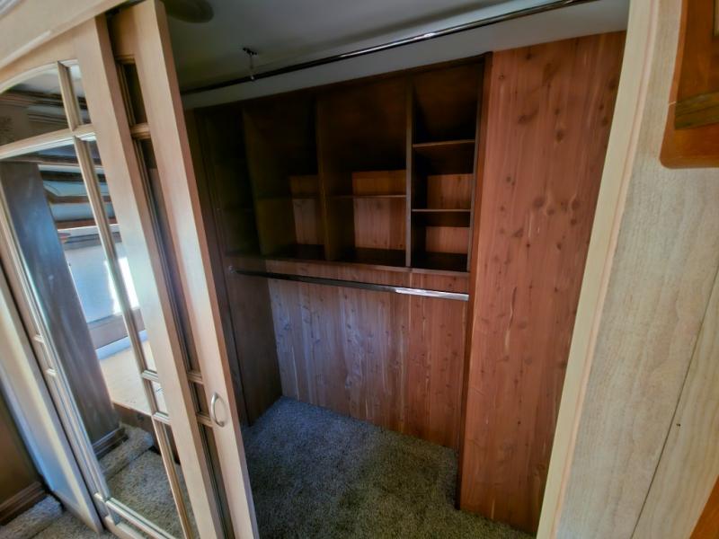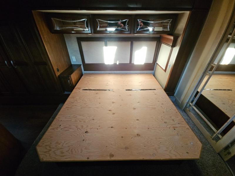 Just outside the bathroom door find a slide out wardrobe with washer and dryer space, plus a king bed and nightstand further into the bedroom within the same slide. You will also find a vanity with drawers including a TV above opposite the bed, and overhead storage on either side. The front wall features a walk-in closet with shelves and a dresser, plus closet organizer, and so much more!