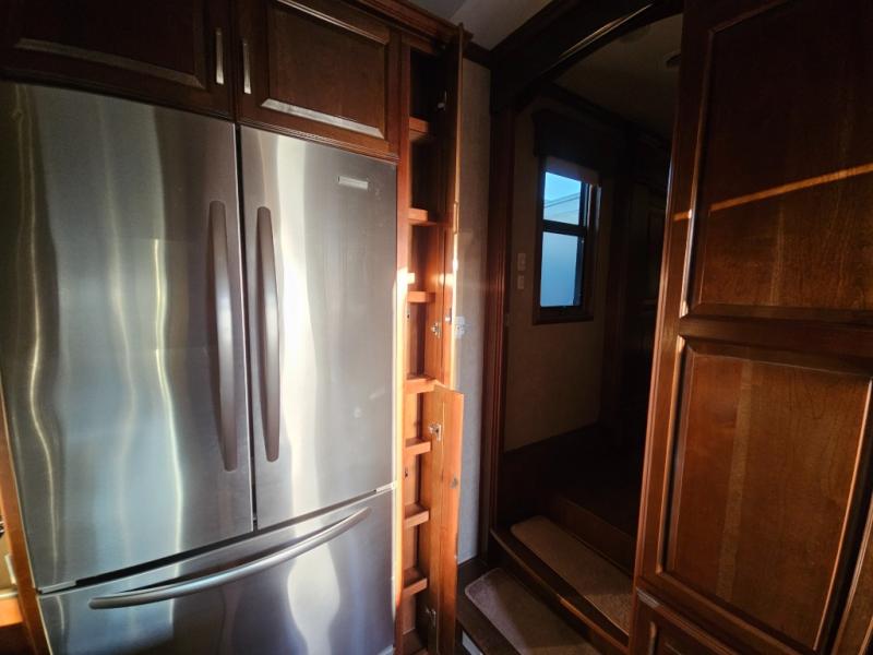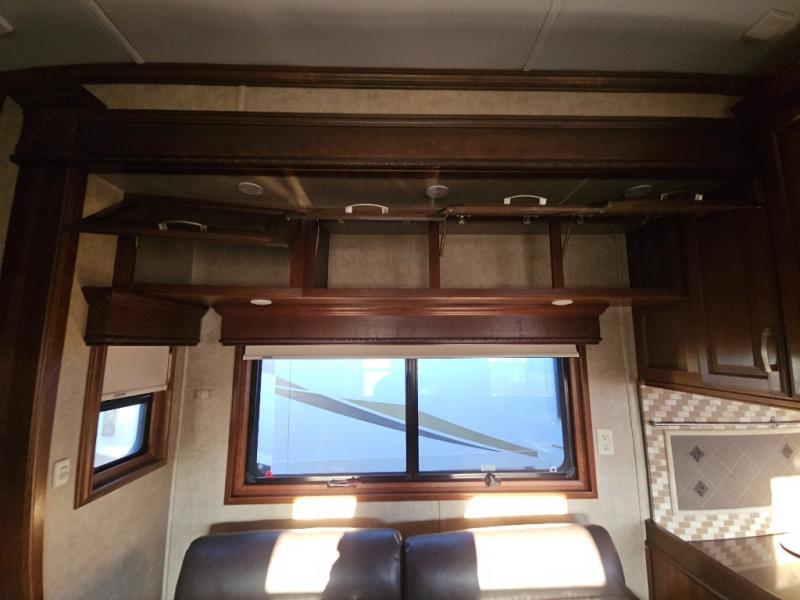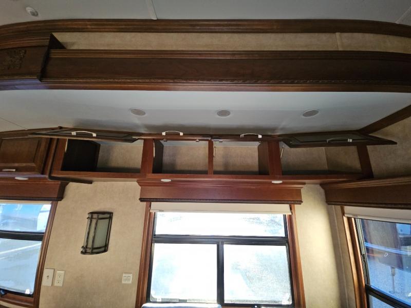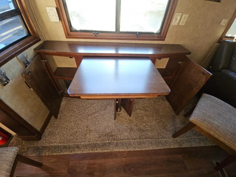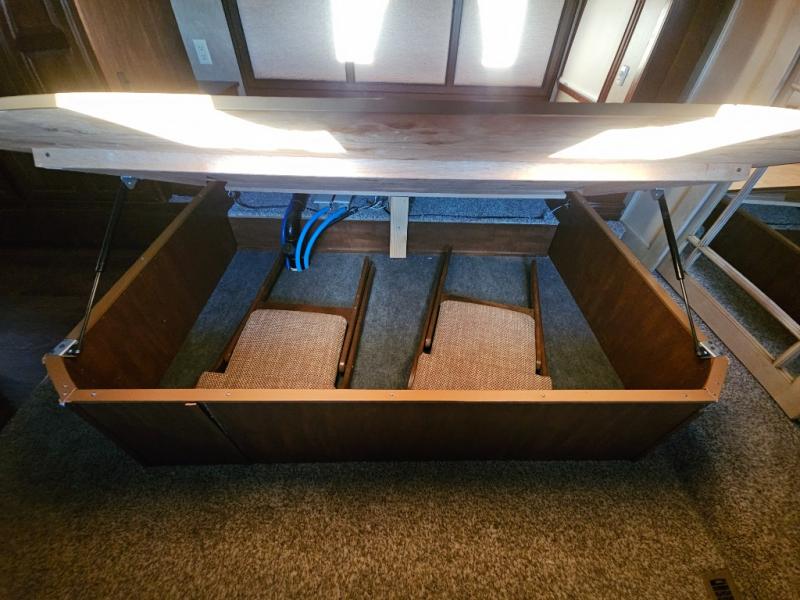 To the left of the entrance enjoy a dining table with two chairs, two recliners, and overhead cabinets the entire width of the slide. Along the rear wall find a power lift TV with side curio cabinets, overhead storage, and an optional fireplace.