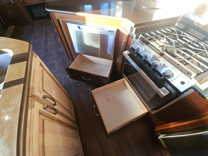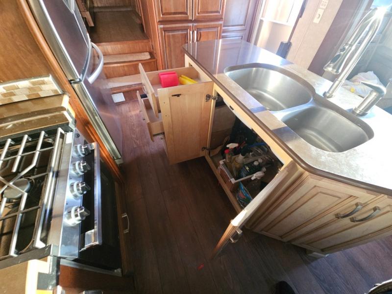 The kitchen is straight ahead through the entry door and features a pantry along the interior wall, a convenient kitchen island with dual sinks, and a slide out refrigerator, three burner range, and counter space with overhead storage. There is also a microwave within the slide that also includes the L-shaped sofa.