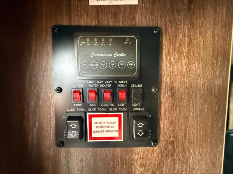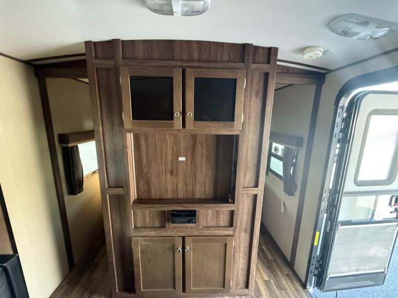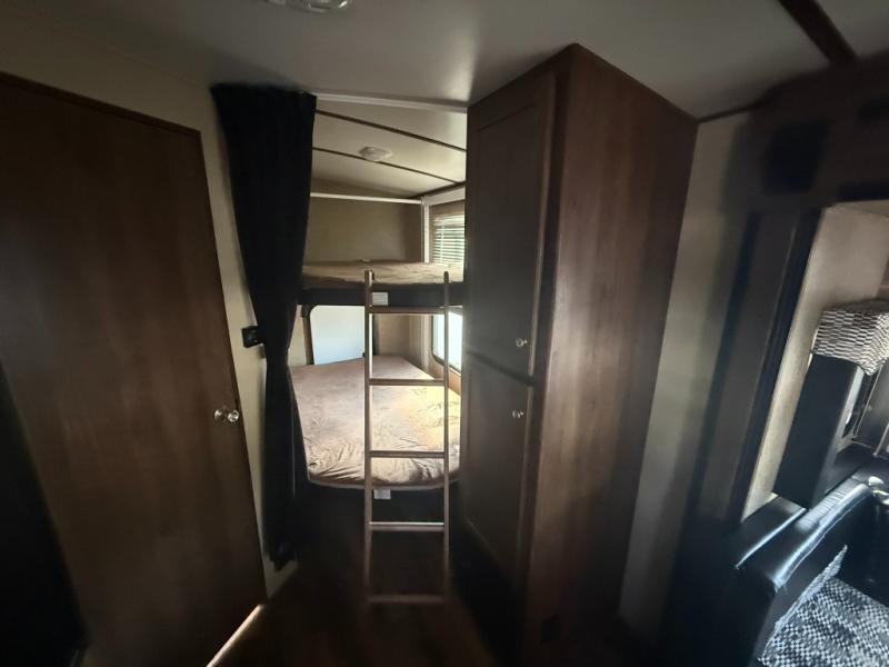 A rear corner bath features a convenient tub/shower, a toilet, and a vanity with sink, plus a private entry door that makes it easy to access from the outside. The opposite corner is where you will find the happi-jack power bunks that will be perfect for the kids at night. The Pac-n-play door makes it easy to stow away things from the outside of the travel.