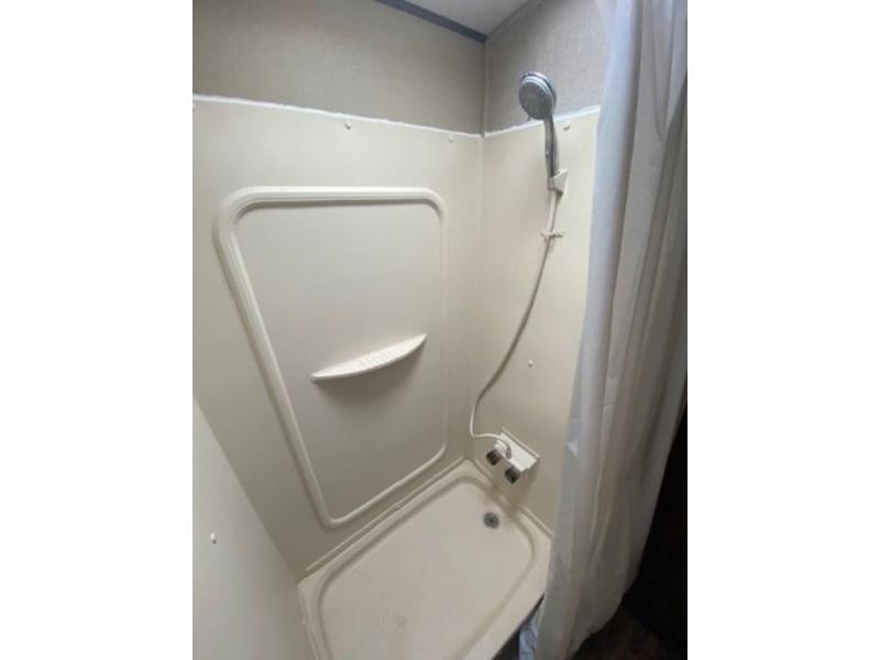 Beyond the kitchen area there is a split bath with shower on the left and private toilet area including a vanity with sink and storage on the right.
