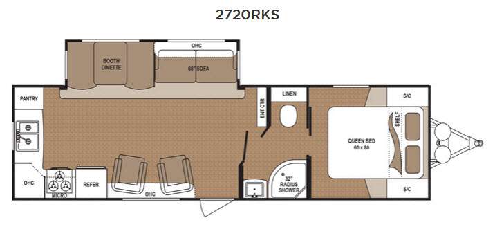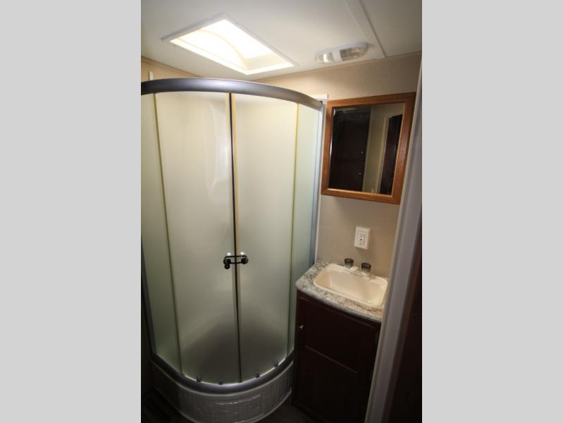 A walk-through bath to your right as you head up front features a corner 32" radius shower and sink on the right and toilet with linen storage above on the left.