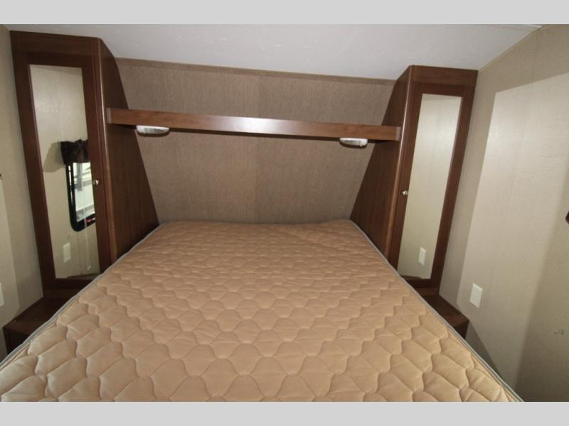 A sliding door opens up into the front bedroom where you will enjoy a restful nights sleep on the queen size bed provided. There are shirt closets on both sides, along with an overhead shelf for your things.
