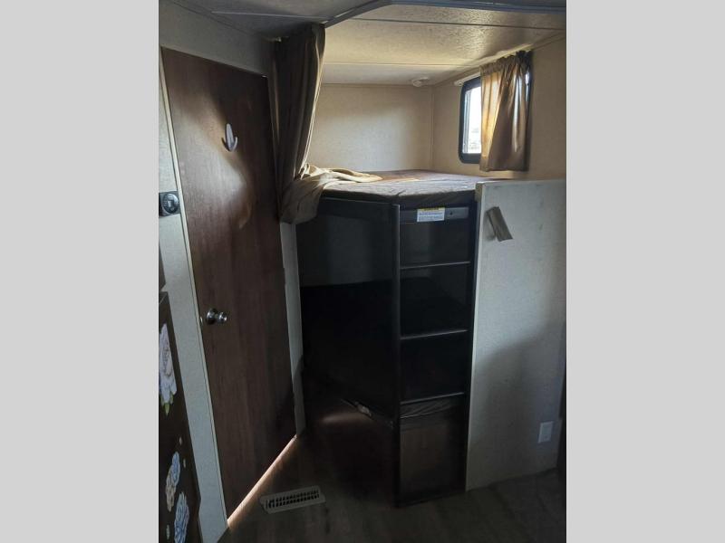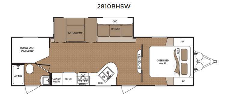 Dutchmen offers the single slide bunkhouse Aspen Trail 2810BHSW. This travel trailer includes a rear corner double bed double bunk with a ladder and privacy curtain.