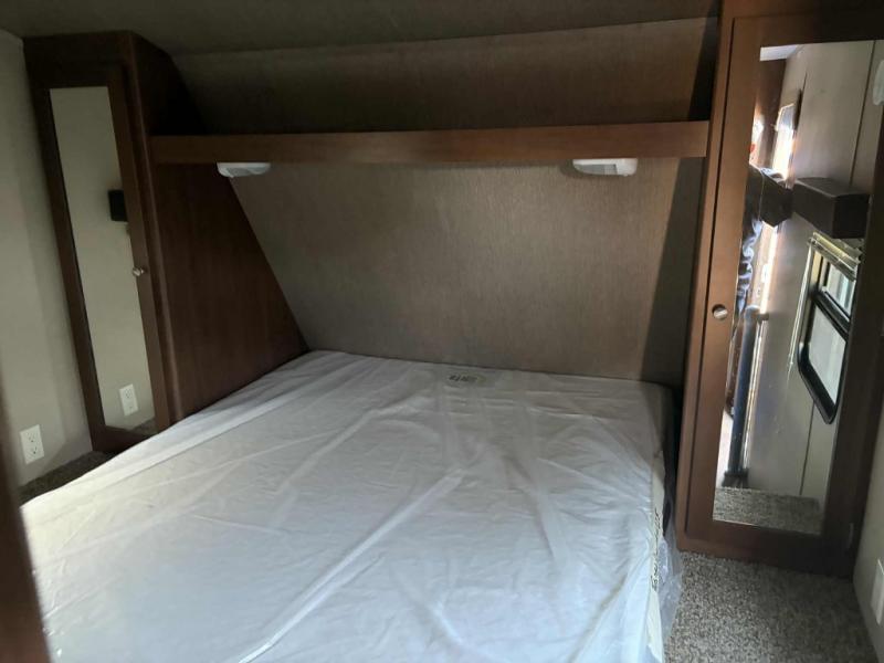 A front private bedroom offers a queen size bed, and shirt closets above nightstands on each side of the bed with a shelf between them, and more!