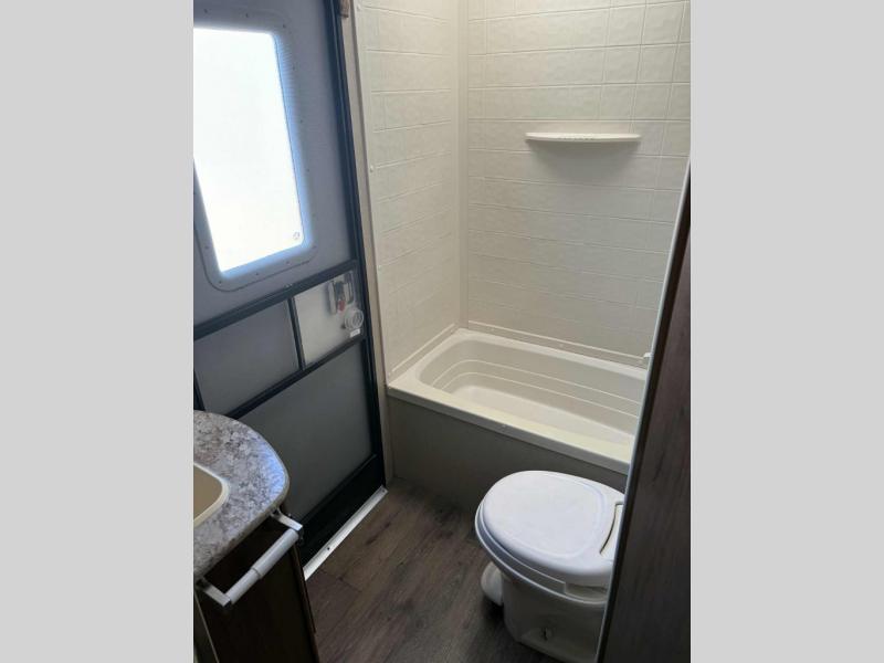 The single slide out opens up this space and has u-shaped dinette and sofa with overhead cabinets above it. An entertainment center is located on the front wall that is shared with the bedroom.