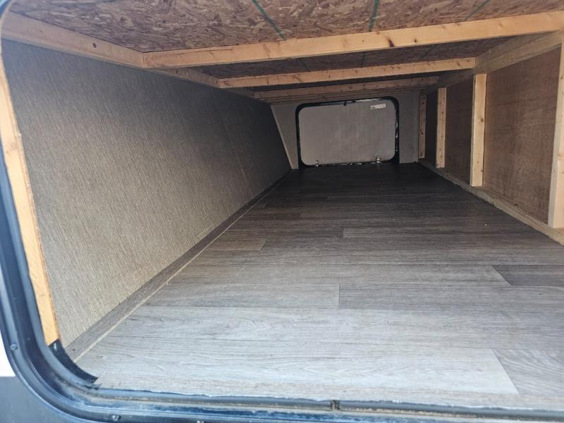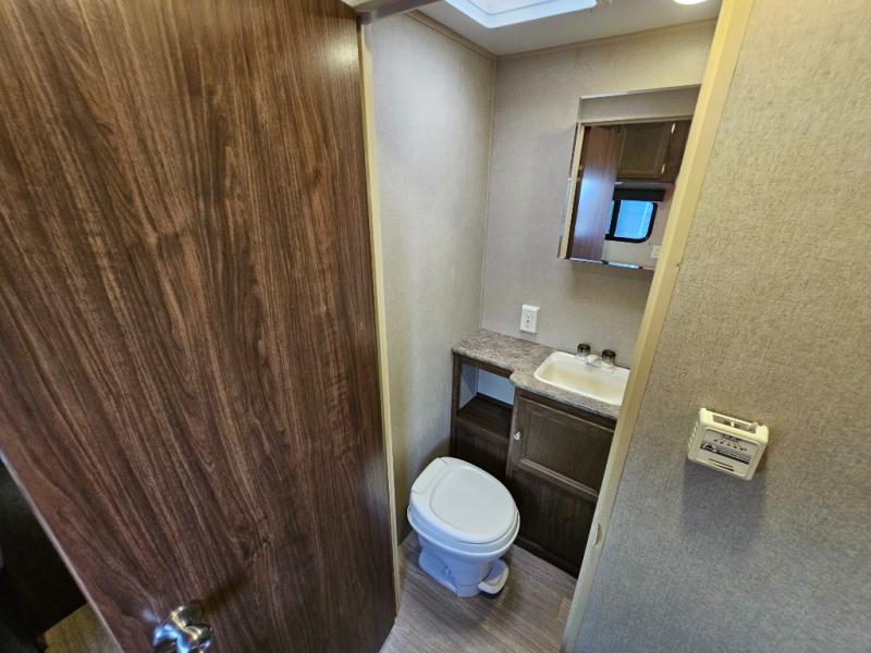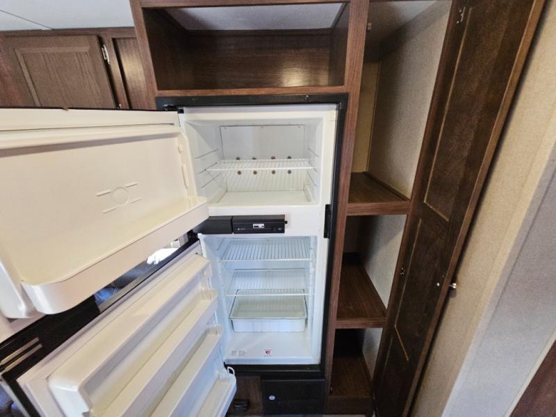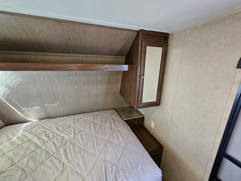 Great couples camper or room for friends!Step inside and see a queen size bed along the front of this unit with a large storage shelf that stretches across the front wall. There is a nightstand and shirt closet just off the foot of the bed to the right of the main entry door.