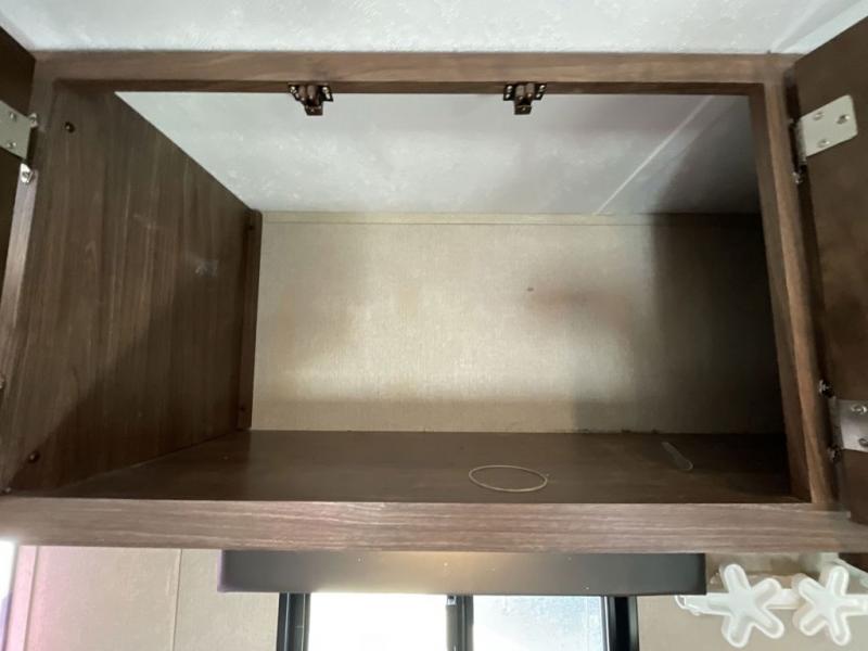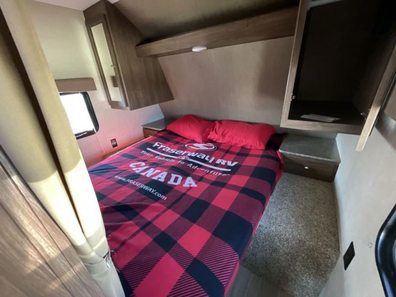 Step inside the main entry and find a master bedroom in front that features a queen size bed, dual bedside shirt closets and nightstands, plus an overhead shelf. The living room entertainment center sits just off the foot of the bed and provides curtains on either side for more bedroom privacy when pulled shut.