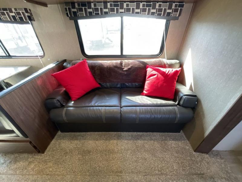 Opposite the door side enjoy relaxing on the sofa or dining at the booth dinette. These are both in a large slide out that helps create more walking around space inside.