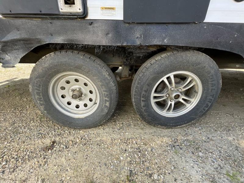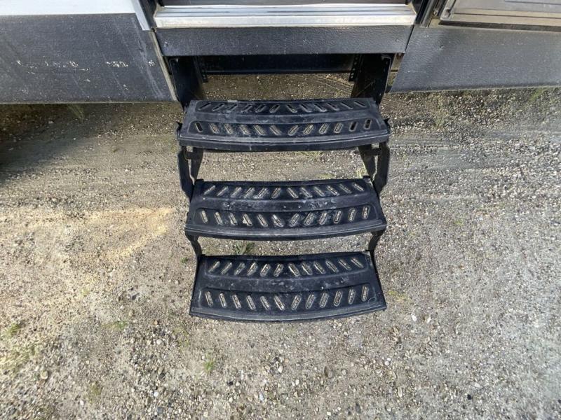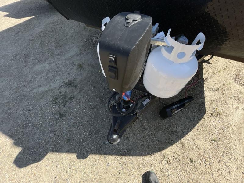 The rear left corner features a convenient full bath providing a shower, toilet, and sink plus the second entry/exit door to the trailer. In the rear right corner is a set of double size bunks with enough space for four people to sleep comfortably.