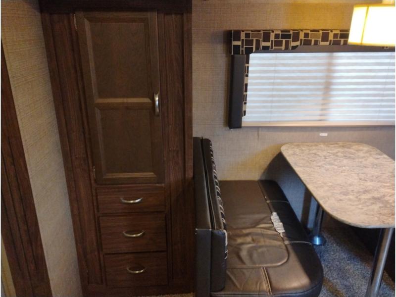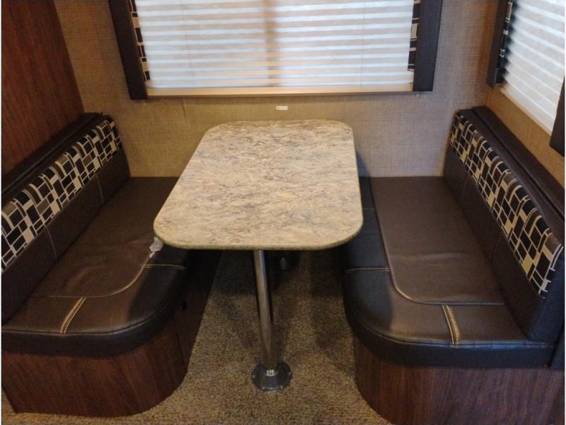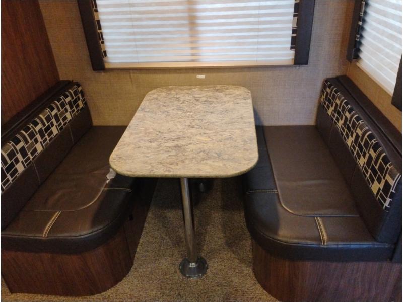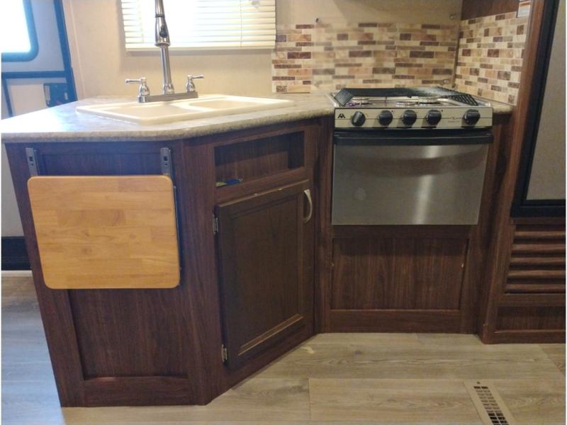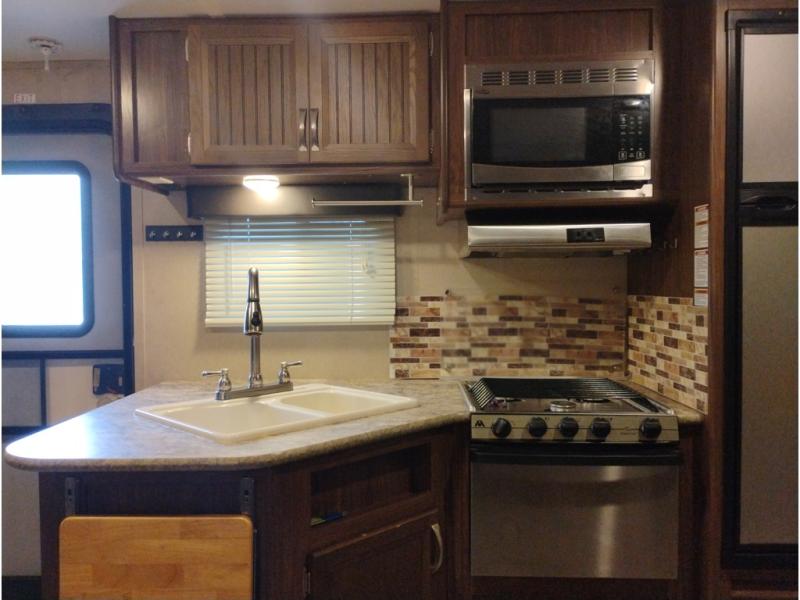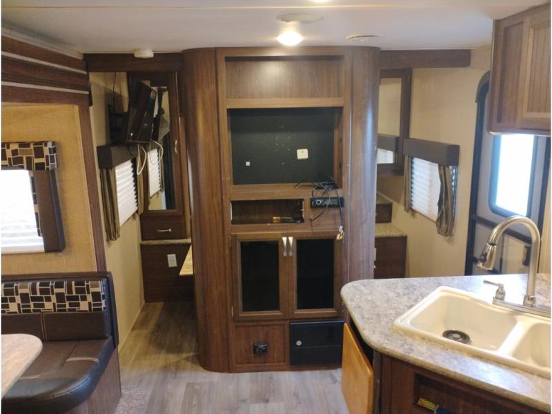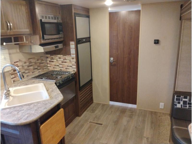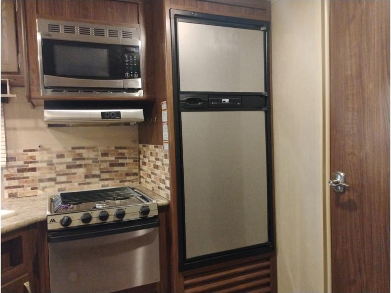As you step inside you will see a single slide out dinette and pantry straight ahead allowing more walking around room in the combined kitchen and living room. On the opposite side you will find an angled countertop with a double kitchen sink, three burner range with microwave above, overhead cabinets, and a refrigerator. When it is time to relax inside, the entertainment center is along the interior wall.