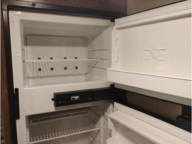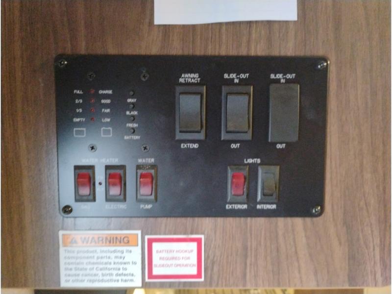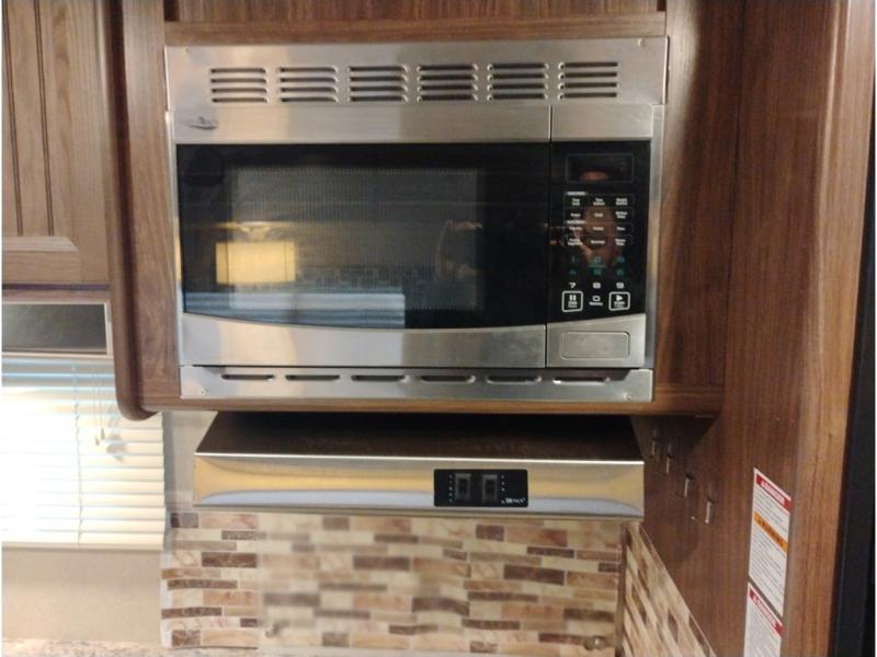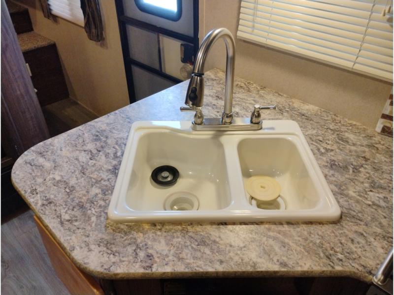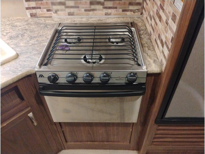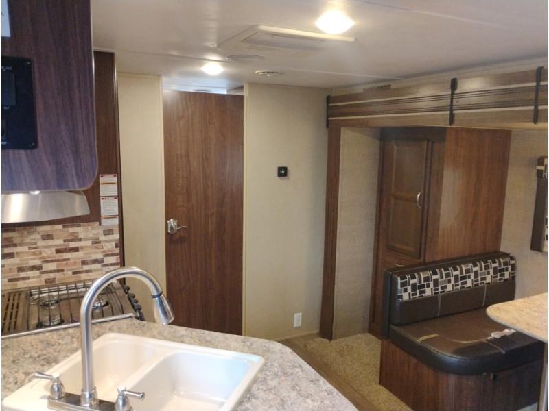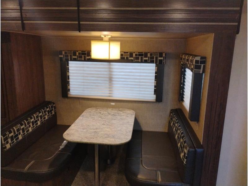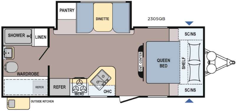 As you step inside you will see a single slide out dinette and pantry straight ahead allowing more walking around room in the combined kitchen and living room. On the opposite side you will find an angled countertop with a double kitchen sink, three burner range with microwave above, overhead cabinets, and a refrigerator. When it is time to relax inside, the entertainment center is along the interior wall.