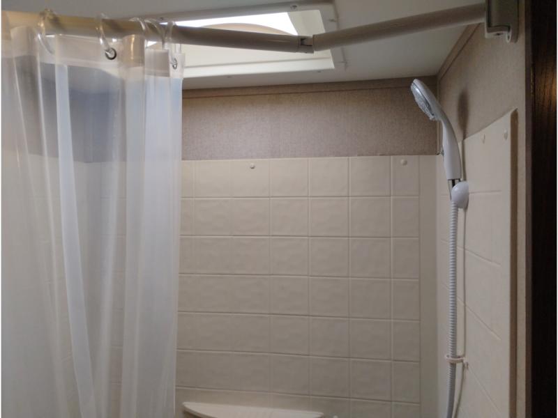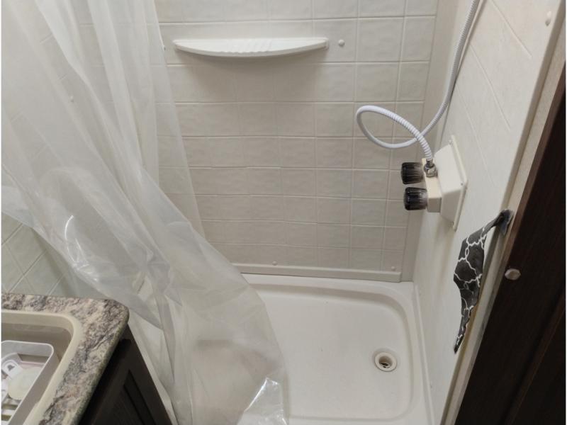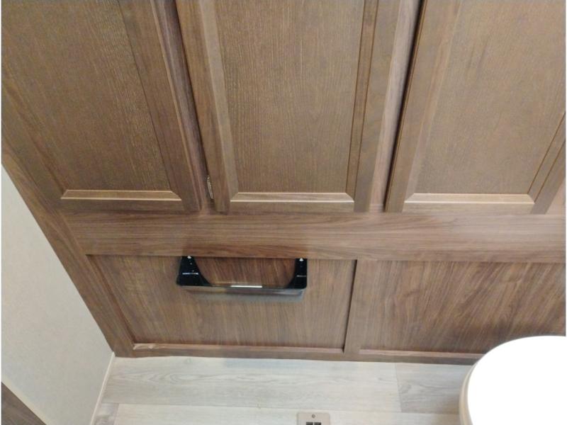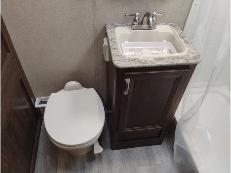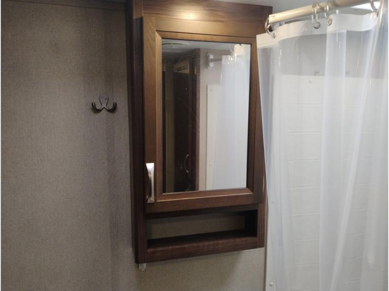In the rear of the trailer there is a private full bathroom including a shower, linen cabinet, sink, toilet, and a wardrobe.