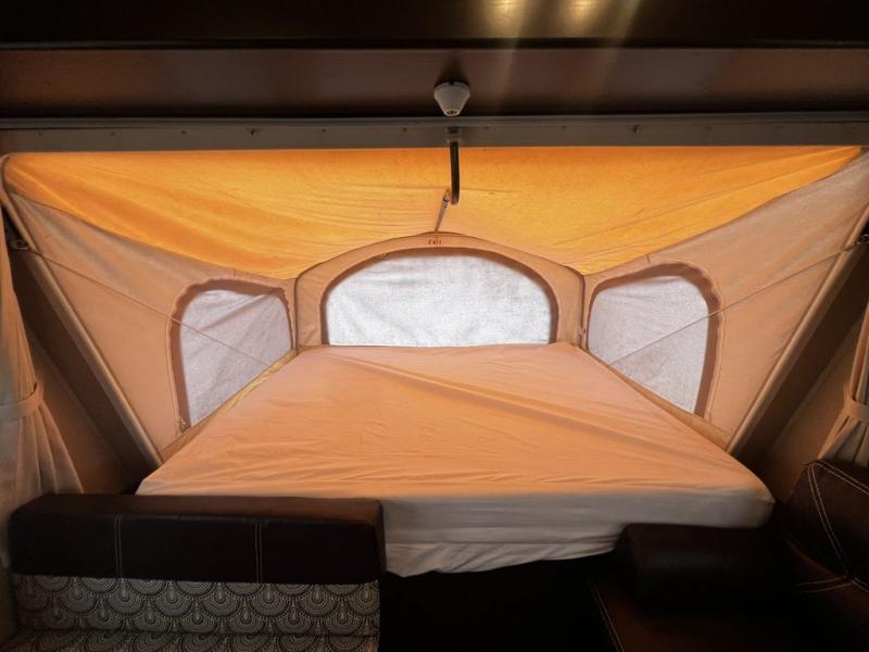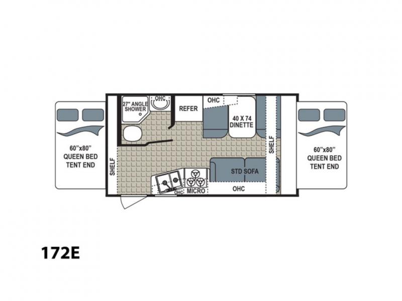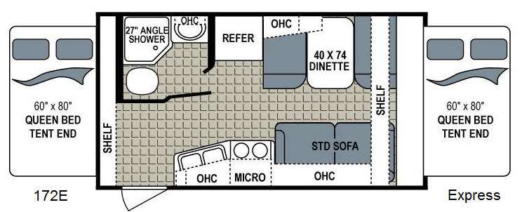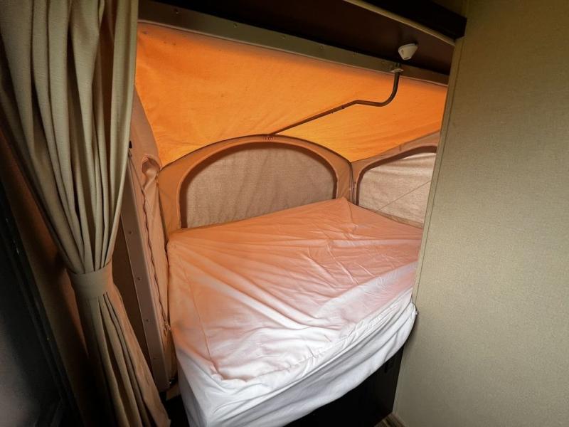 This Kodiak Express expandable 172E by Dutchmen RV features front and rear tent end beds for sleeping. Each have a storage shelf above as you enter the tent end bunk.