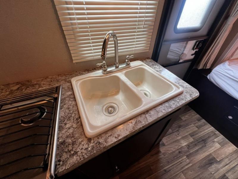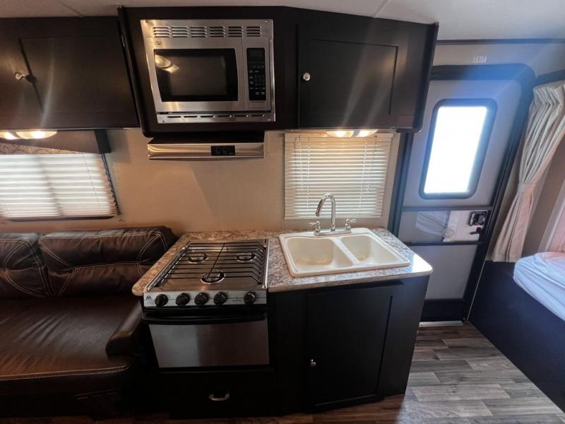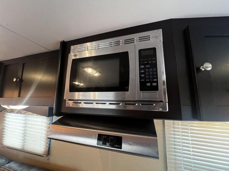To the right of the door you will find a convenient double sink for kitchen cleanup, a three burner range with microwave oven, and an overhead cabinet for storage. The refrigerator is located along the opposite side of the room next to the booth dinette that is 40" x 74". The dinette table can be folded down to create more sleeping space if needed.