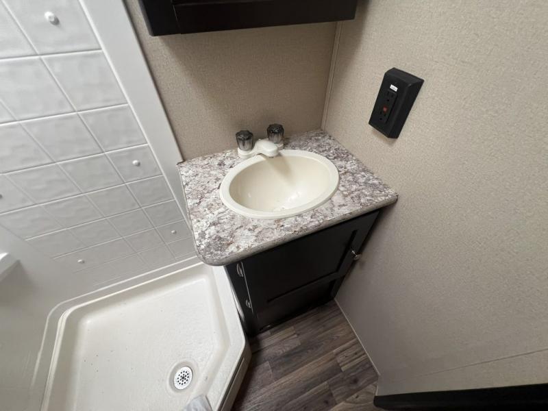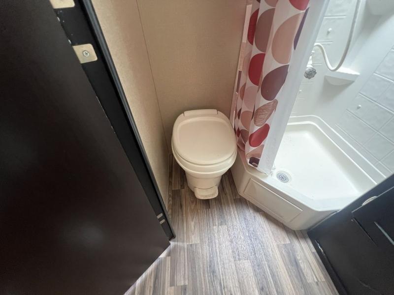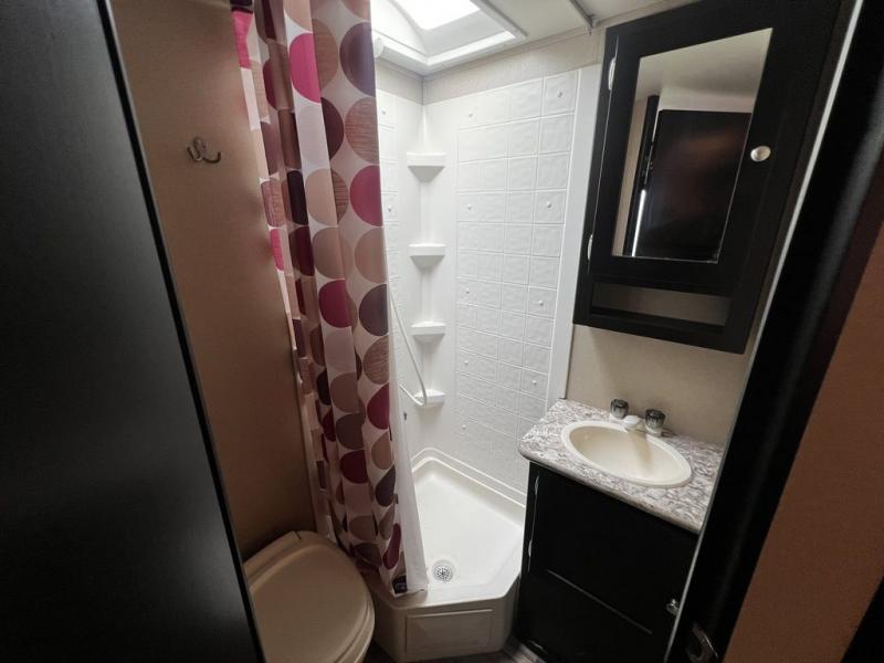 As you enter the main door there is a full bath straight ahead which features a 27" angled shower, toilet, and sink with overhead cabinet for your things.