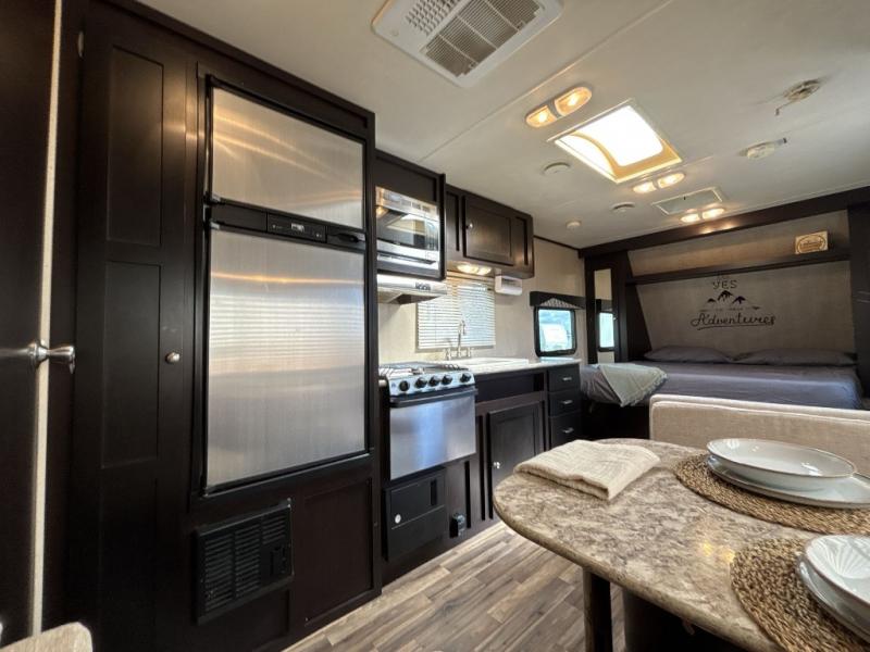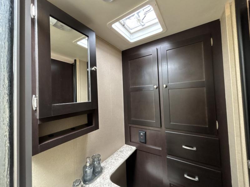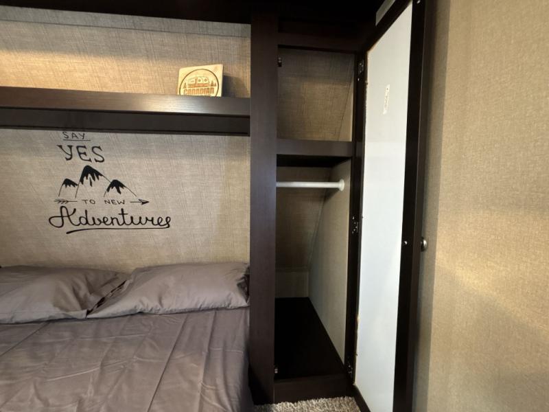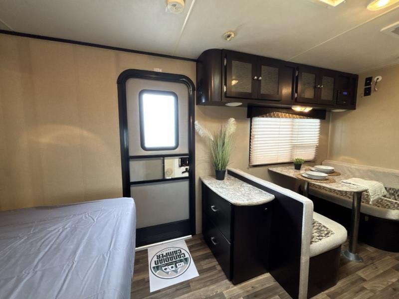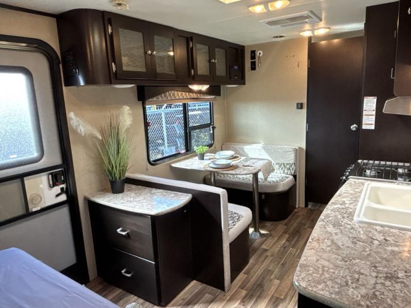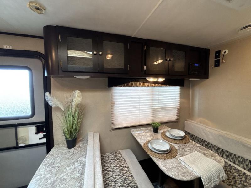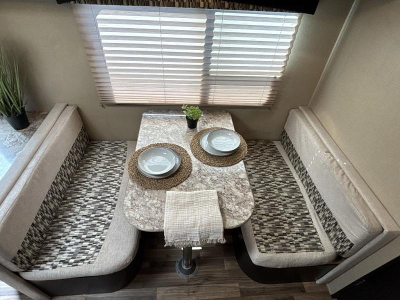 Enjoy dining at the booth dinette opposite the range, and to the left of the main entry door. There is additional storage space above to help keep things neatly tucked away and organized. The dinette can also easily be transformed into sleeping space for an extra camper if needed.